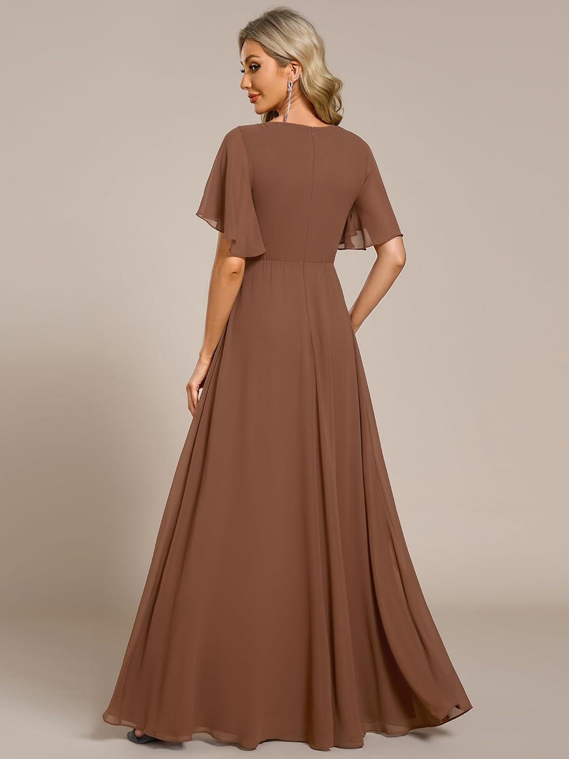 Ever-Pretty Women’s Chiffon A-Line Ruched Short Sleeves Applique Waist V Neck Formal Evening Dresses(Brown)