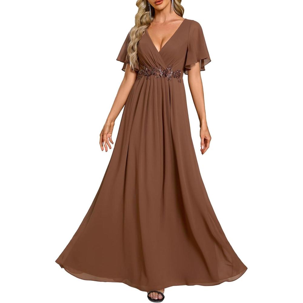 Ever-Pretty Women's Chiffon A-Line Ruched Short Sleeves Applique Waist V Neck Formal Evening Dresses(Brown)