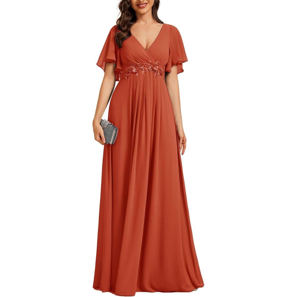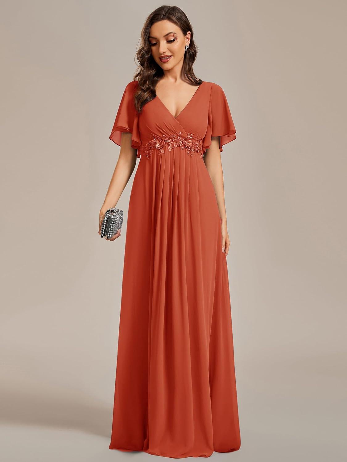 Ever-Pretty Women’s Chiffon A-Line Ruched Short Sleeves Applique Waist V Neck Formal Evening Dresses(Burnt Orange)