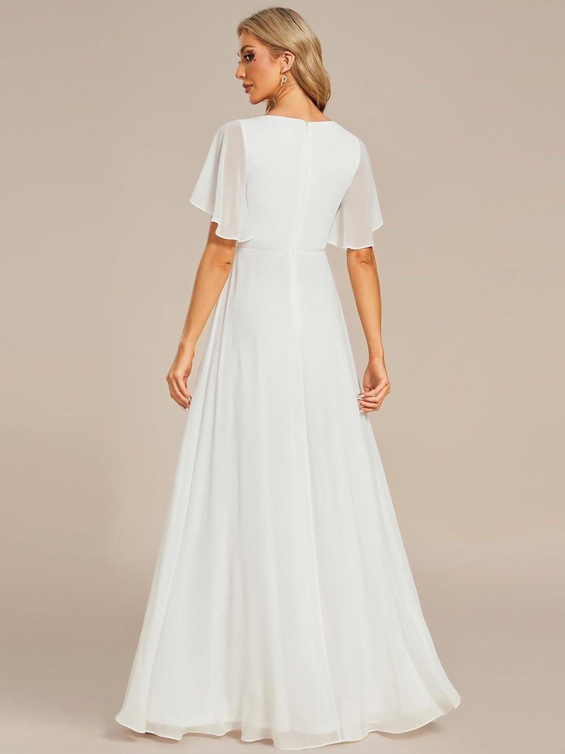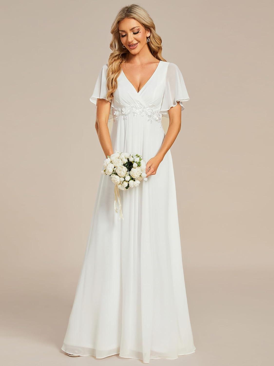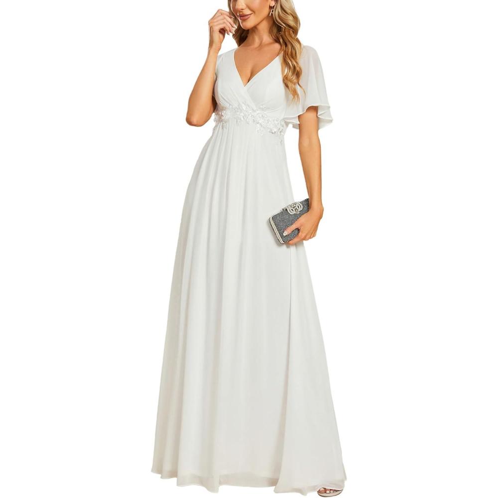 Ever-Pretty Women’s Chiffon A-Line Ruched Short Sleeves Applique Waist V Neck Formal Evening Dresses(C:cream)