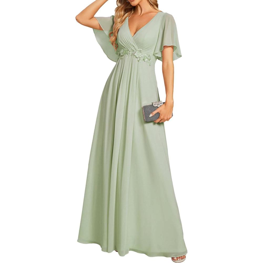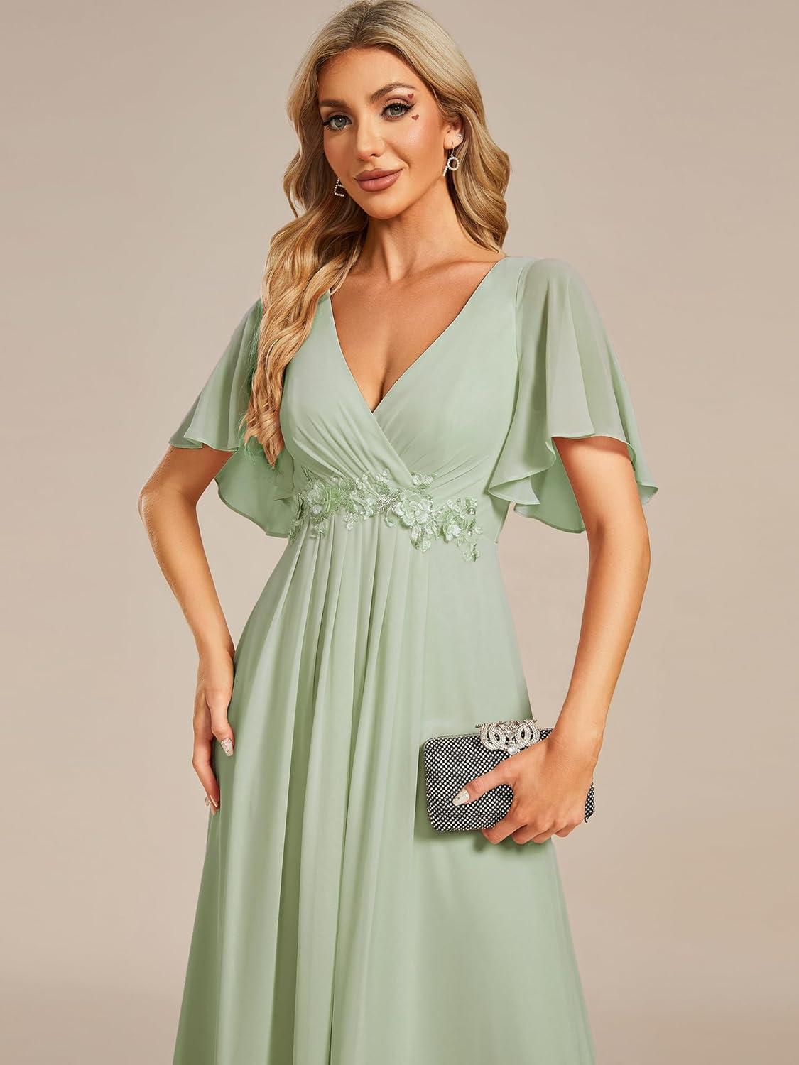 Ever-Pretty Women’s Chiffon A-Line Ruched Short Sleeves Applique Waist V Neck Formal Evening Dresses(Mint Green)
