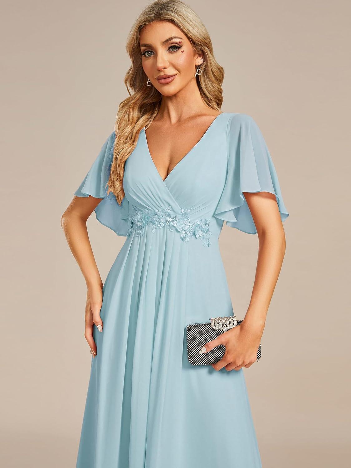 Ever-Pretty Women’s Chiffon A-Line Ruched Short Sleeves Applique Waist V Neck Formal Evening Dresses(Sky Blue)