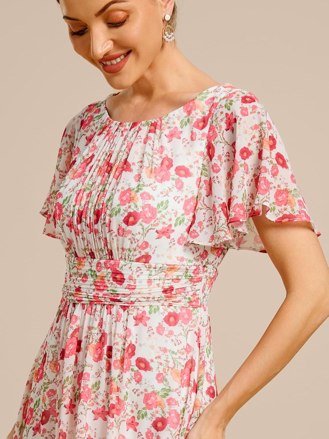Ever-Pretty Women’s Chiffon Crew Neck Empire Waist Short Sleeve Semi Formal Dresses Wedding Guest Dress 02053(White Red)