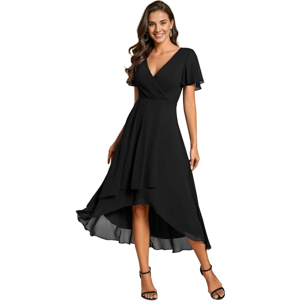 Ever-Pretty Women’s Chiffon Formal Dresses V Neck Ruffle Sleeves Pleated High Low Wedding Guest Dress 2084(A-black)