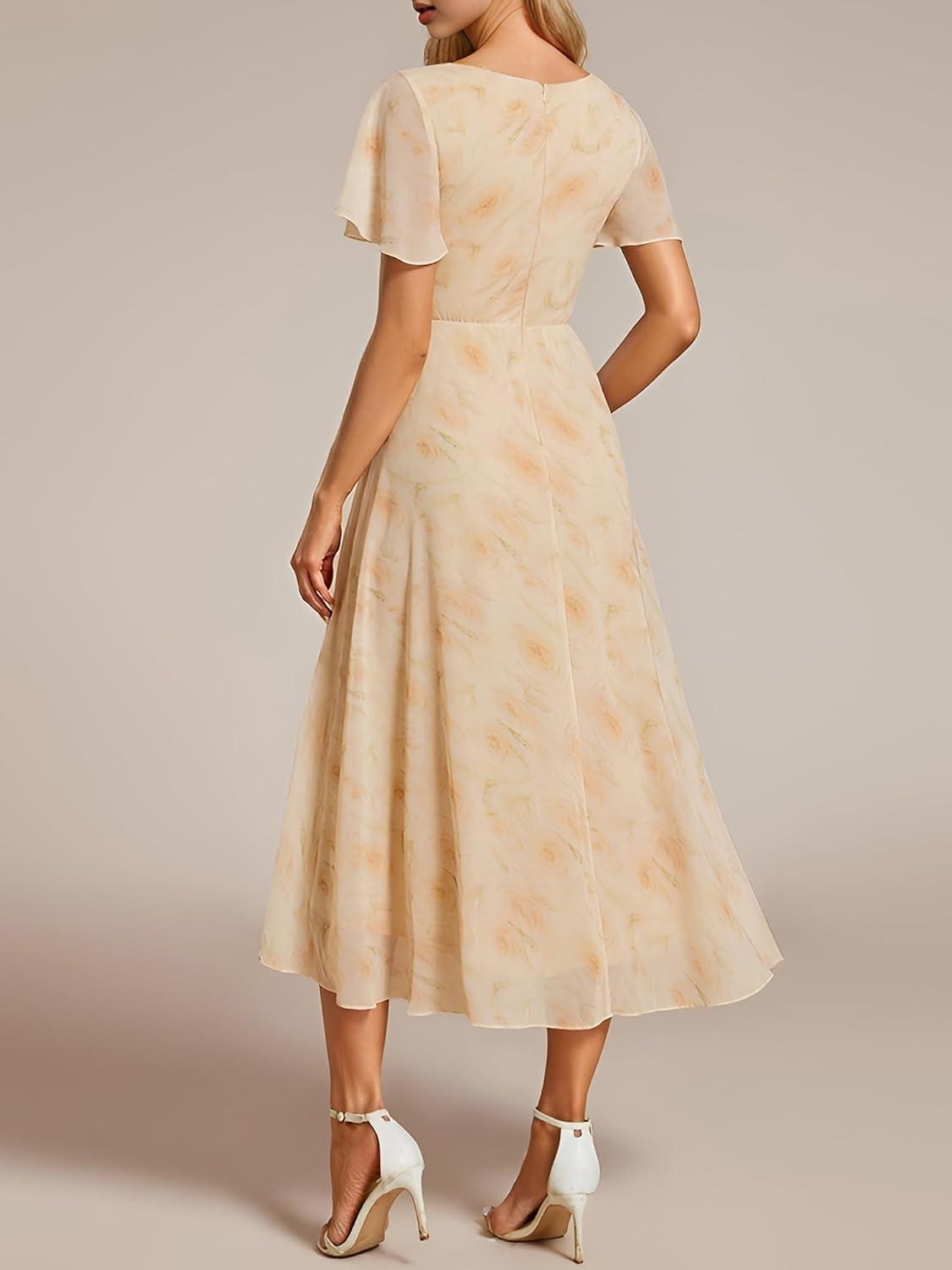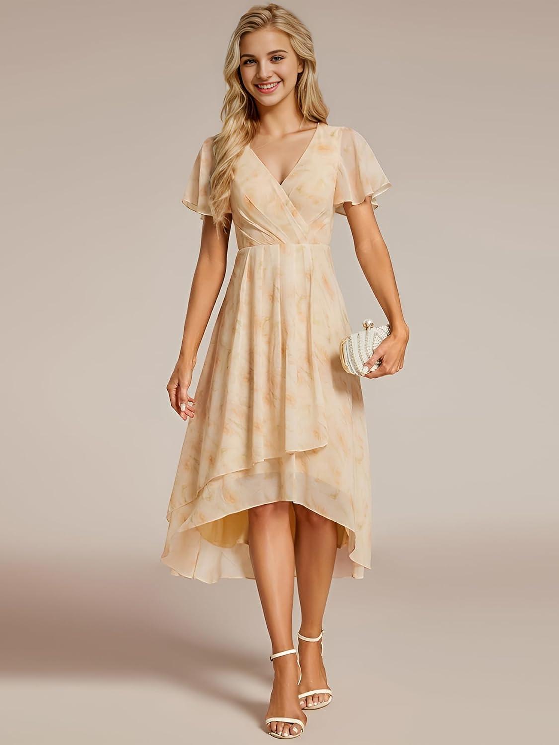 Ever-Pretty Women's Chiffon Formal Dresses V Neck Ruffle Sleeves Pleated High Low Wedding Guest Dress 2084(Golden Roses)