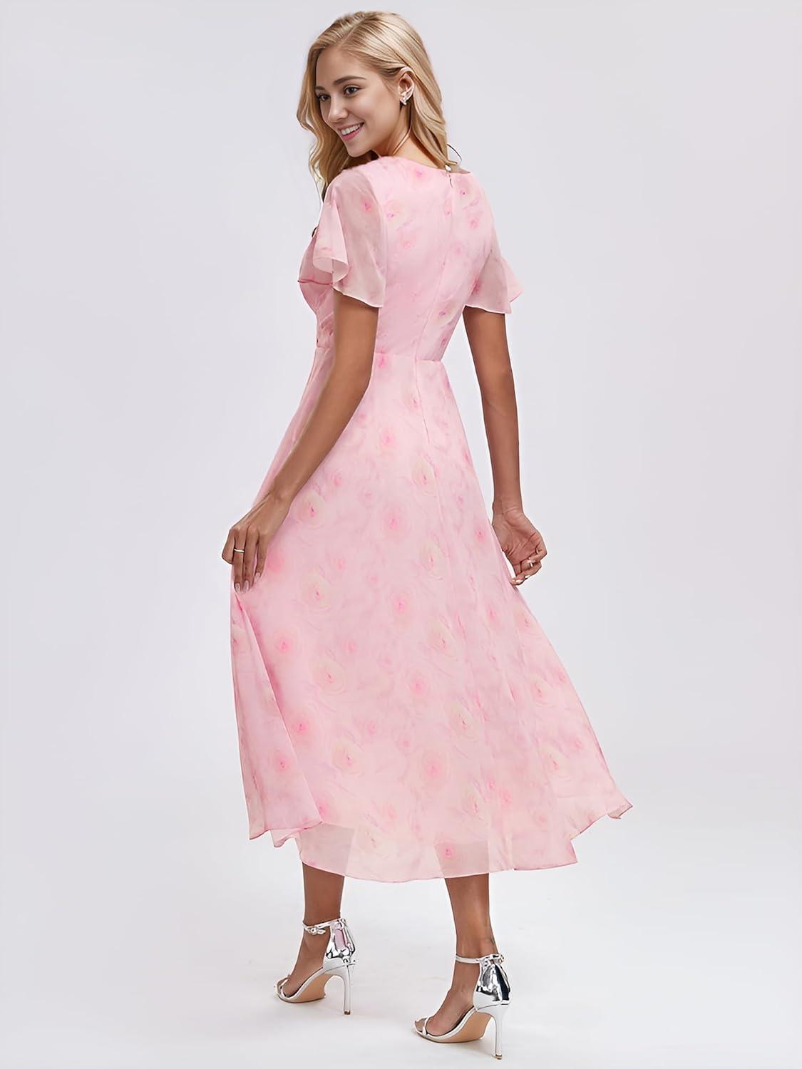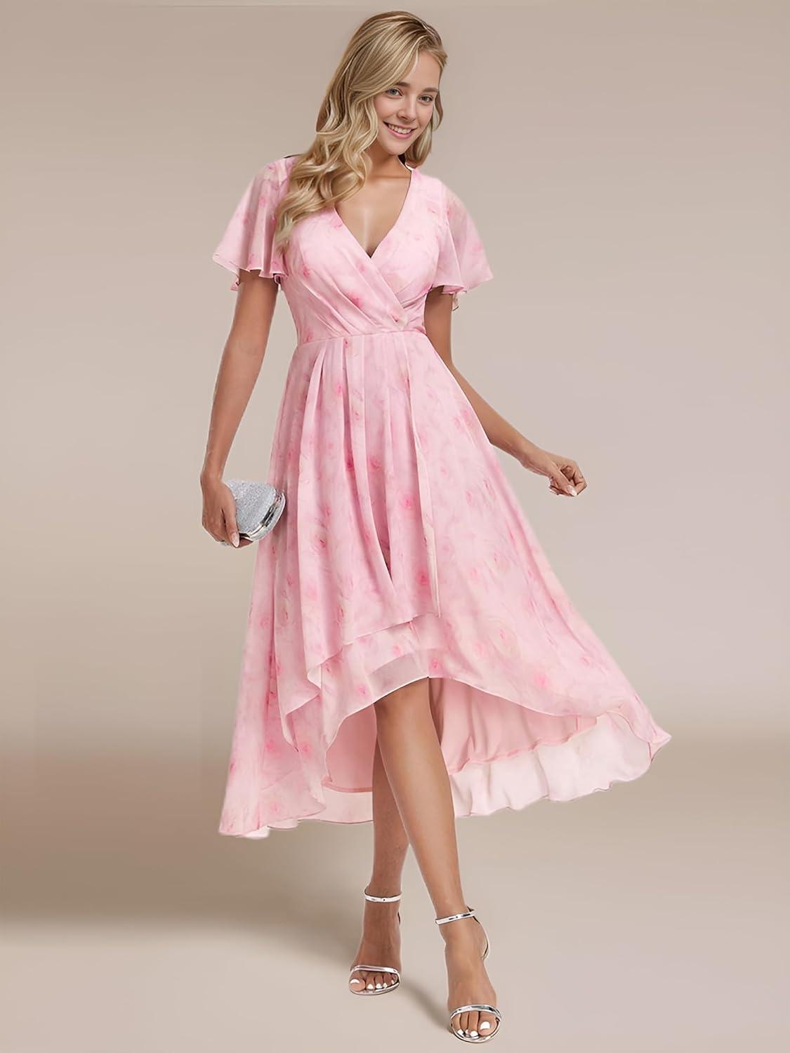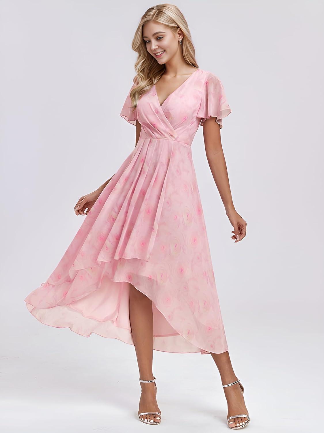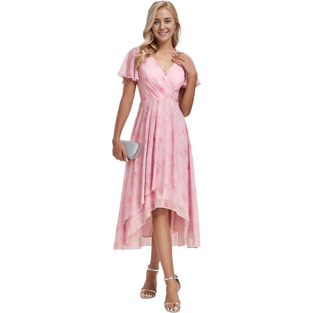 Ever-Pretty Women’s Chiffon Formal Dresses V Neck Ruffle Sleeves Pleated High Low Wedding Guest Dress 2084(Light Purple Roses)