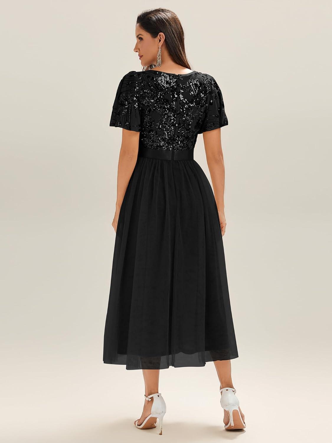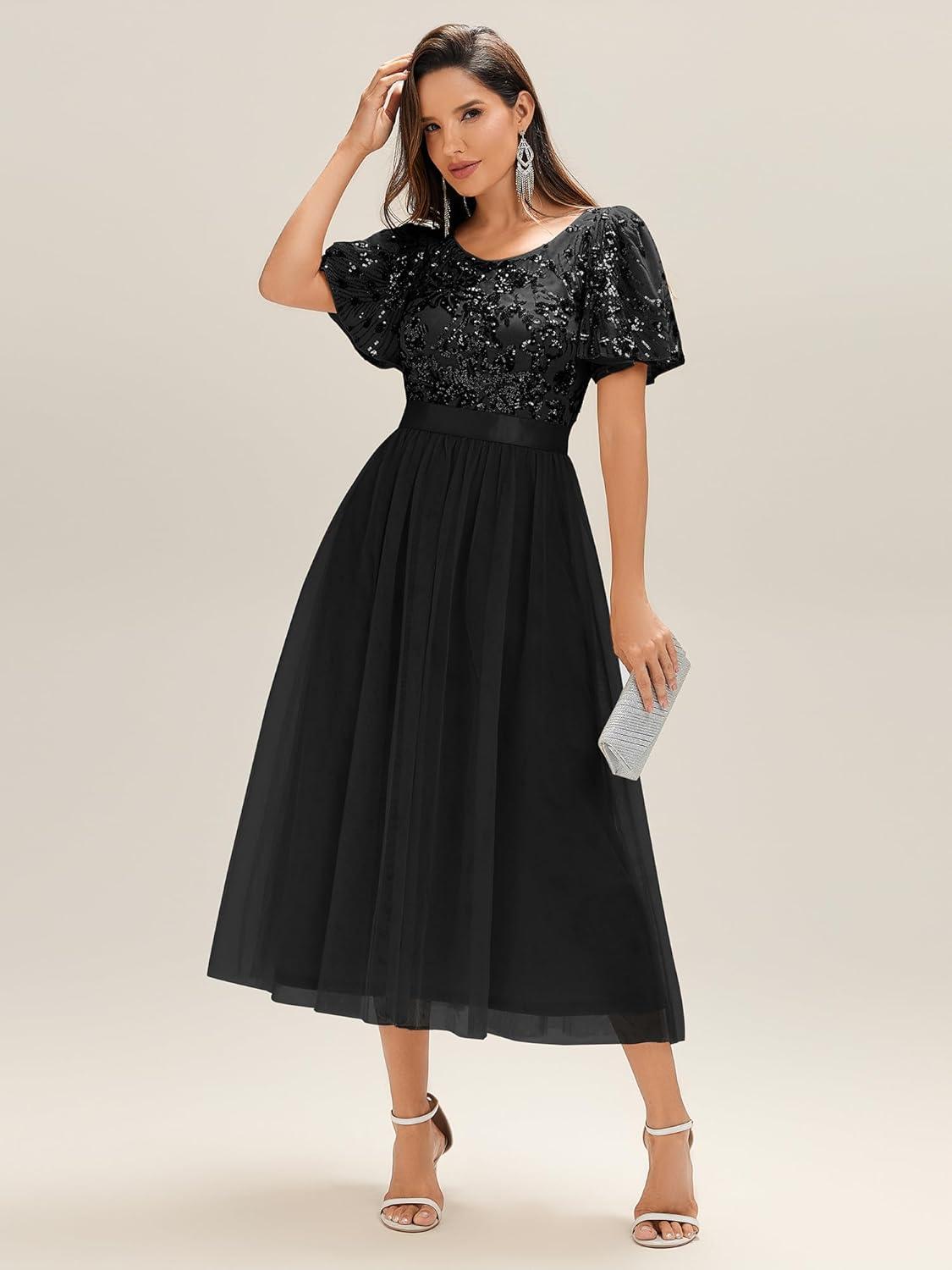 Ever-Pretty Women’s Classic Round Neck Sequin Tulle Short Sleeves Midi Semi Formal Dresses 02549(Black)