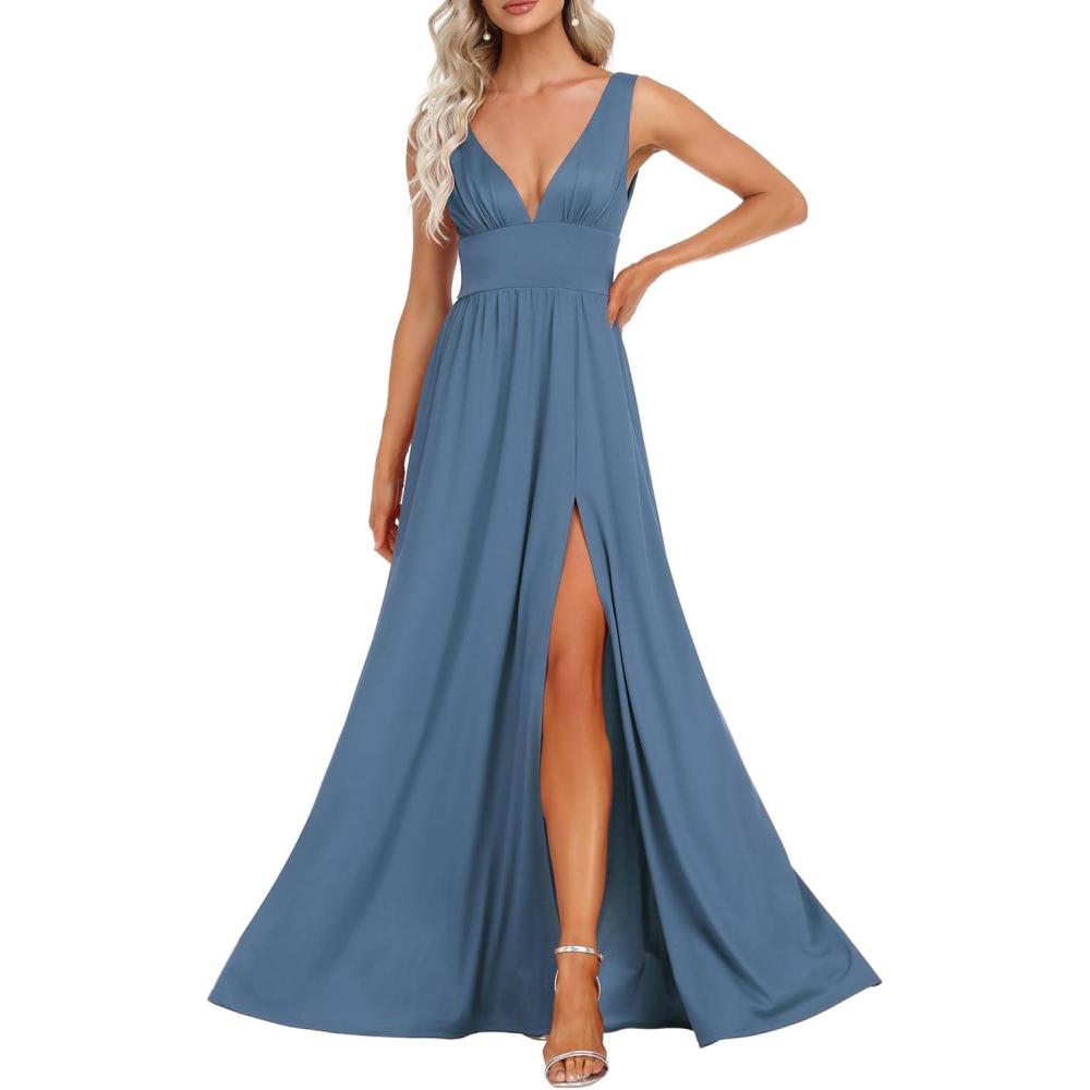 Ever-Pretty Women’s Deep V-Neck Sleeveless Side Slit Floor Length Bridesmaid Wedding Guest Dress 0168B(Dusty Navy)