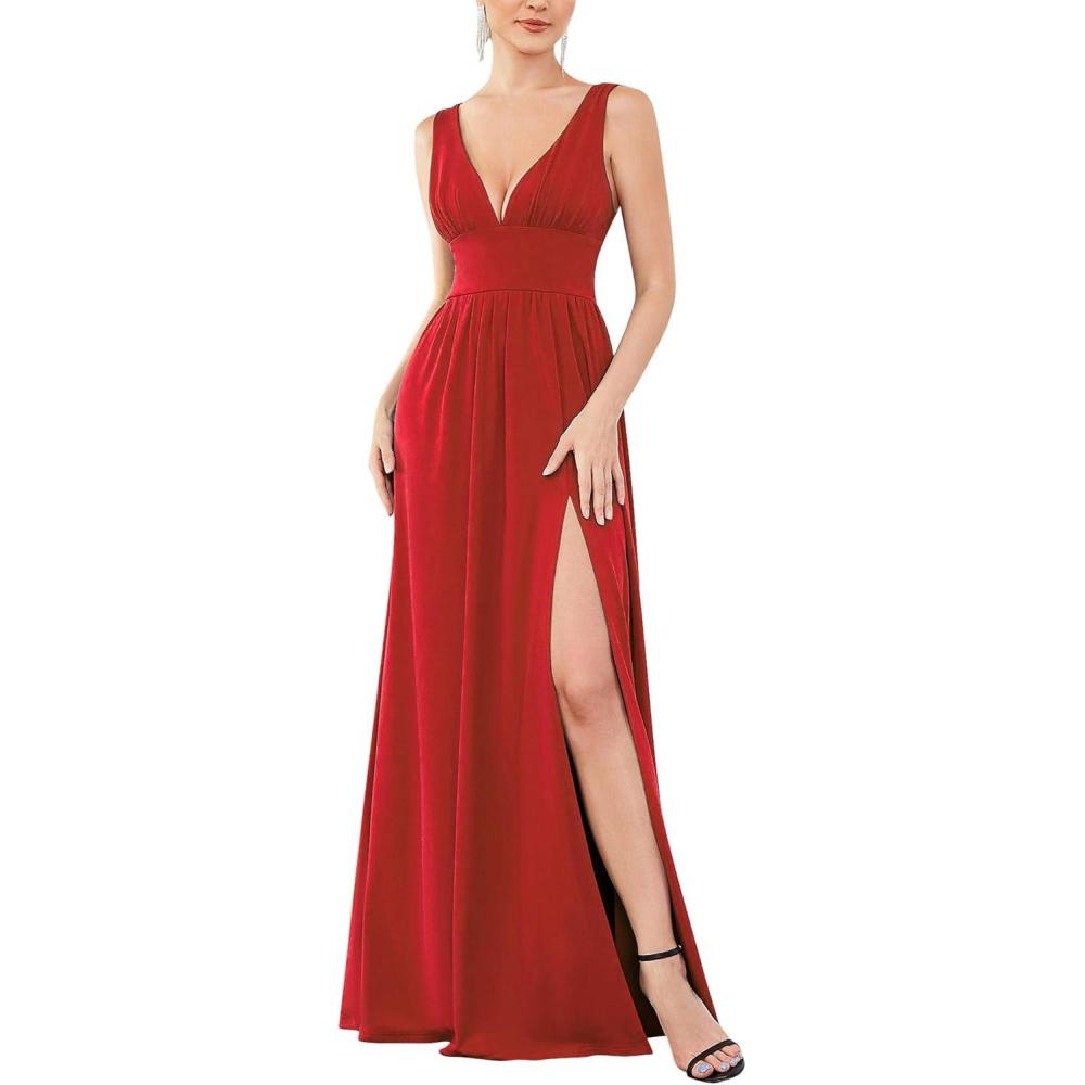 Ever-Pretty Women’s Deep V-Neck Sleeveless Side Slit Floor Length Bridesmaid Wedding Guest Dress 0168B(Red)