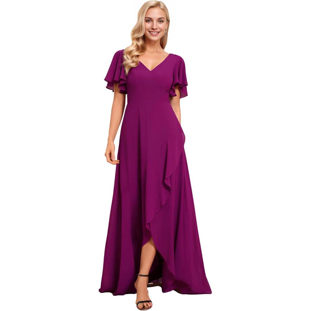 Ever-Pretty Women’s Double V Neck A Line Ruffle Hem Backless High Low Chiffon Bridesmaid Dresses Vestidos Elegante 01749(Fuchsia)