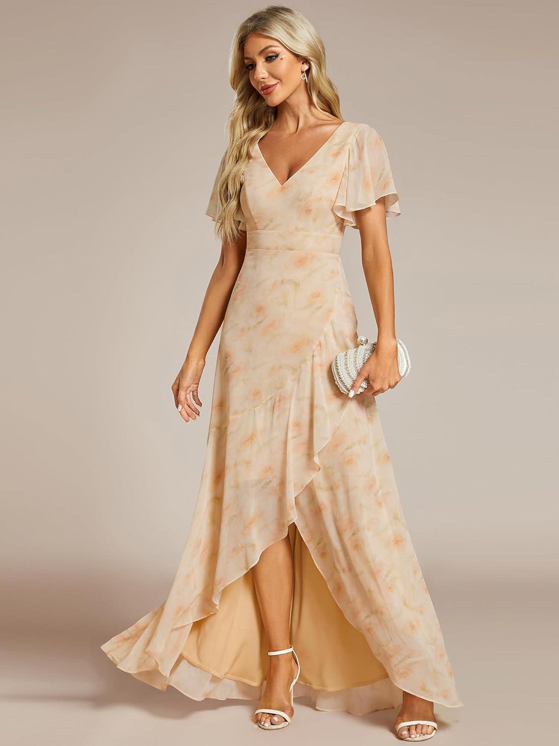 Ever-Pretty Women's Double V Neck A Line Ruffle Hem Backless High Low Chiffon Bridesmaid Dresses Vestidos Elegante 01749(Golden Roses)