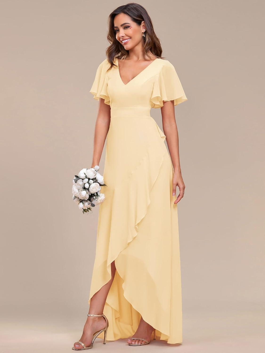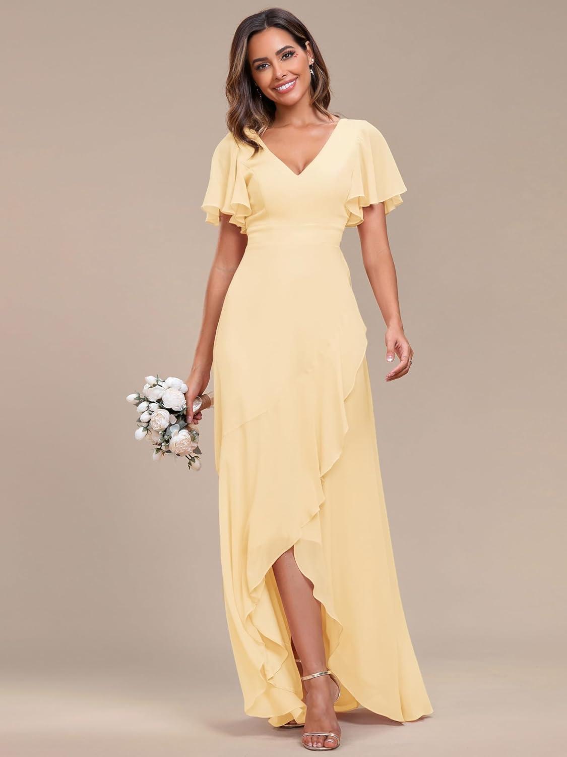 Ever-Pretty Women's Double V Neck A Line Ruffle Hem Backless High Low Chiffon Bridesmaid Dresses Vestidos Elegante 01749(Yellow)