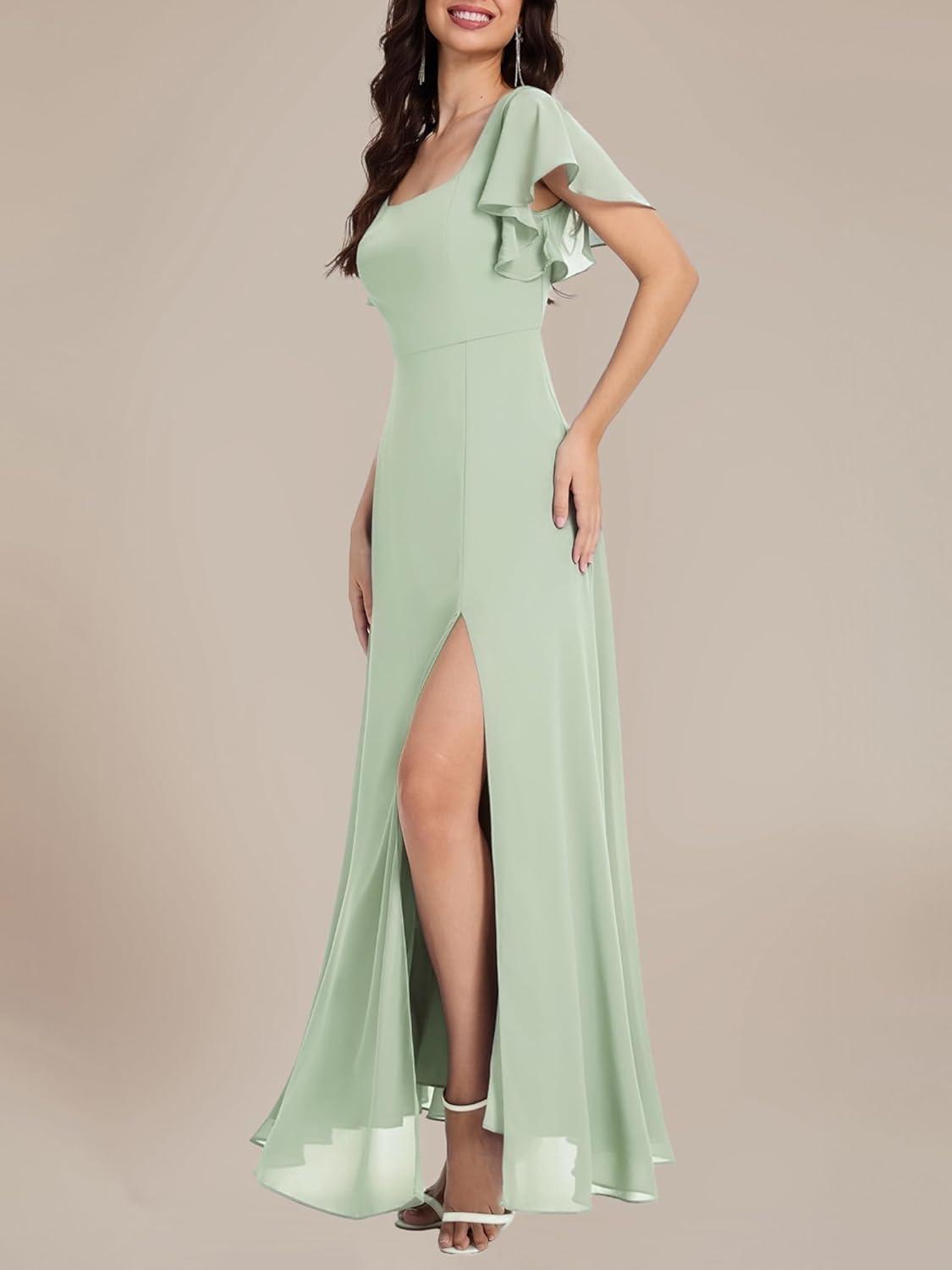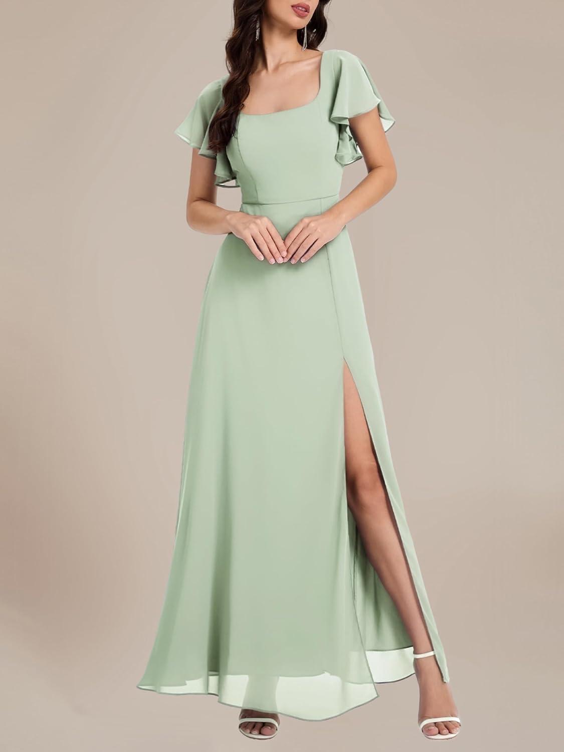 Ever-Pretty Women’s Elegant Chiffon Flared Sleeves Front Split Square Neck Floor Length Evening Dresses(Mint Green)