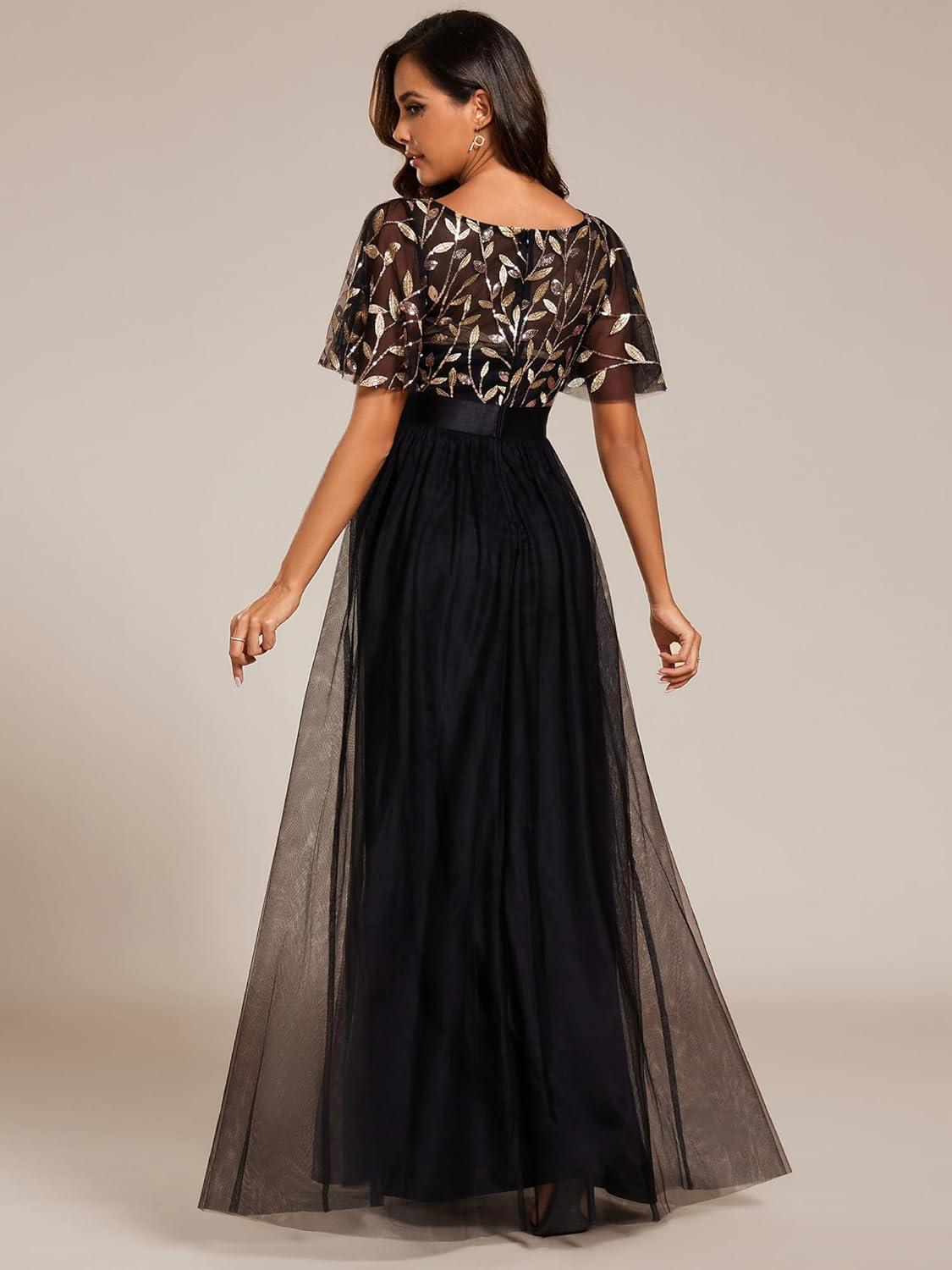 Ever-Pretty Women's Elegant Crew Neck Sequin Ruffle Sleeve Empire Waist A-Line Long Formal Evening Dresses(Black Gold)