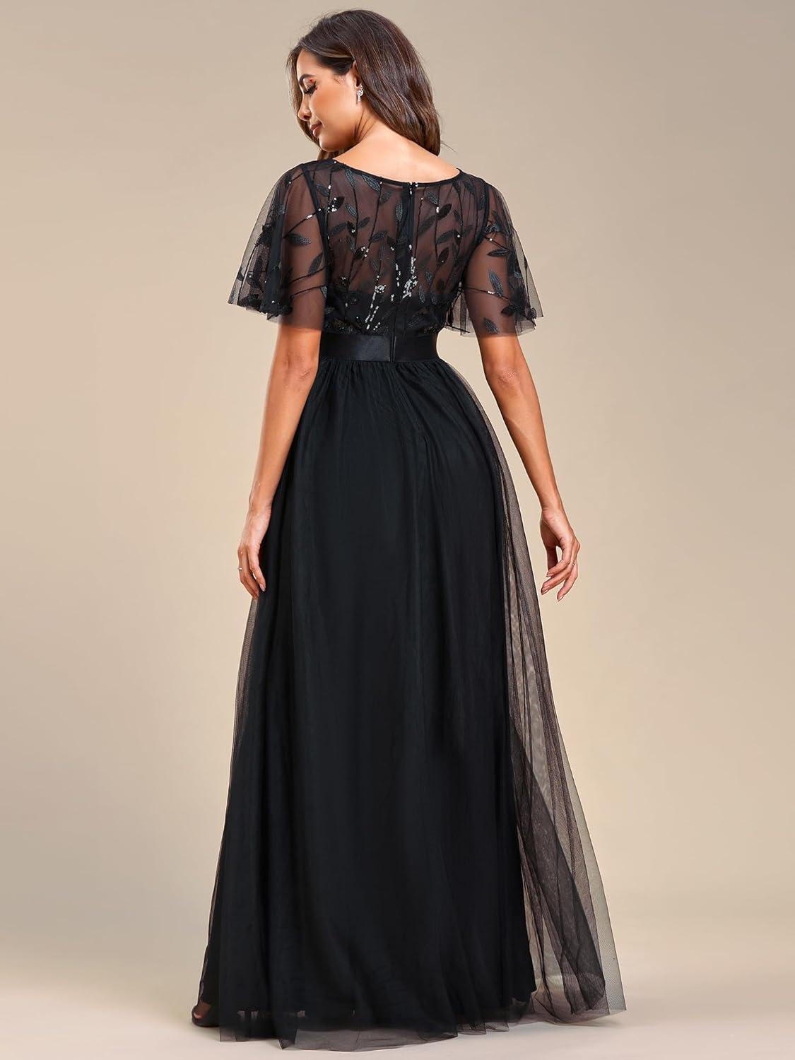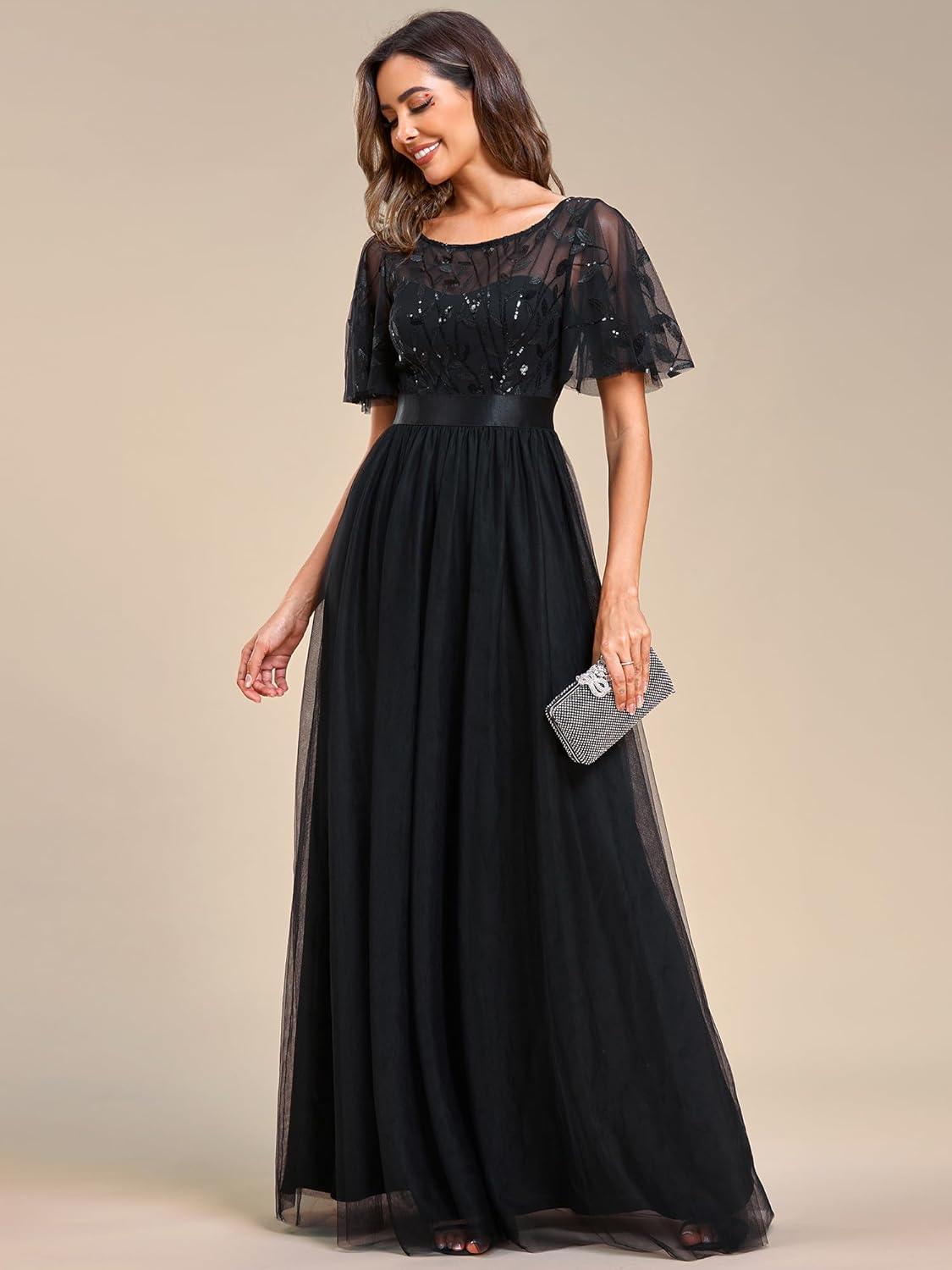 Ever-Pretty Women’s Elegant Crew Neck Sequin Ruffle Sleeve Empire Waist A-Line Long Formal Evening Dresses(Black)