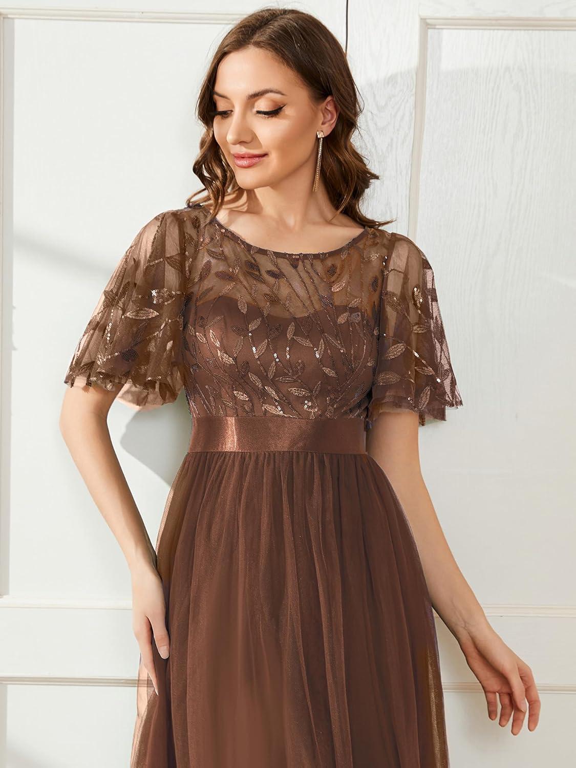 Ever-Pretty Women’s Elegant Crew Neck Sequin Ruffle Sleeve Empire Waist A-Line Long Formal Evening Dresses(Brown)