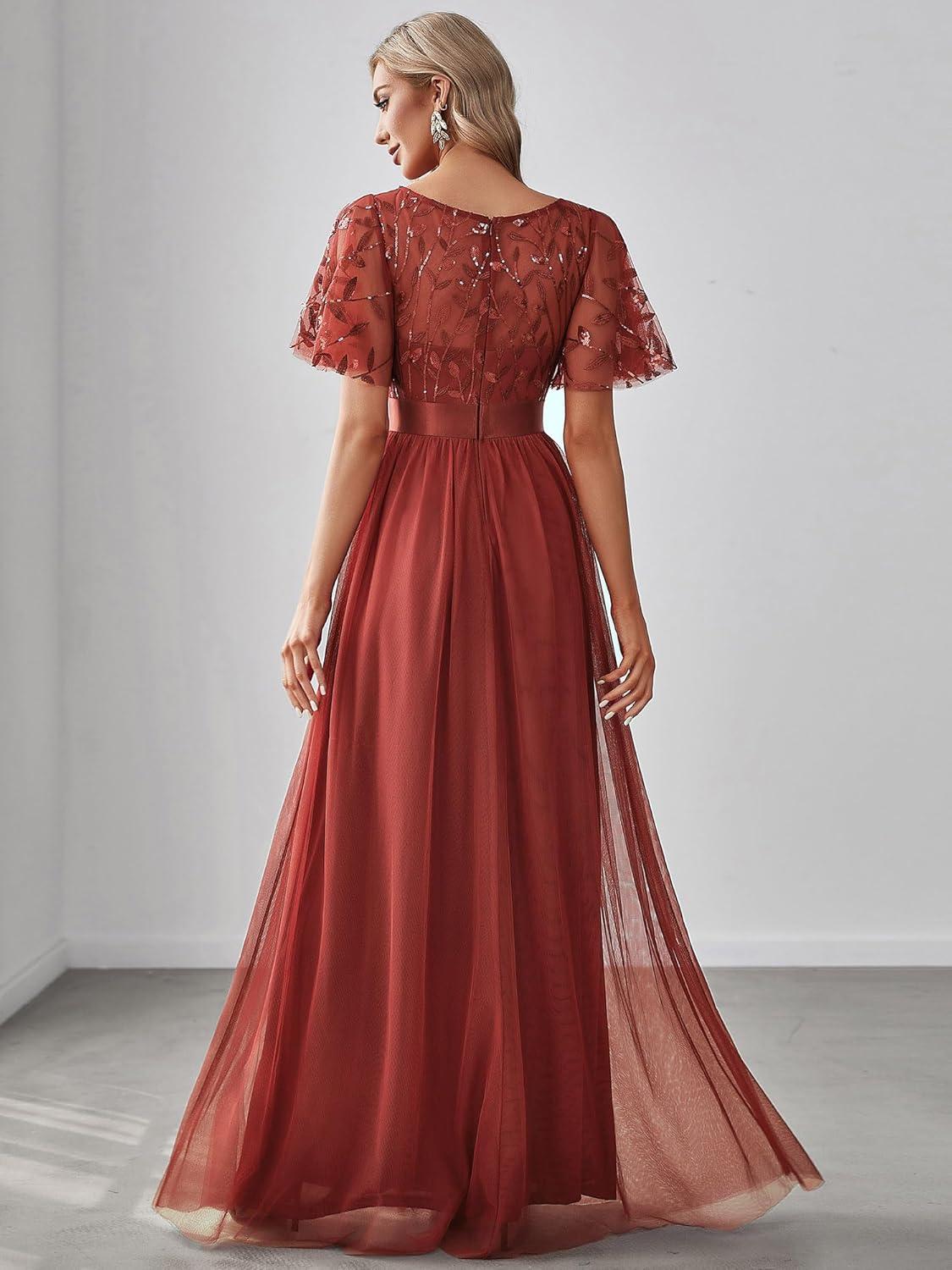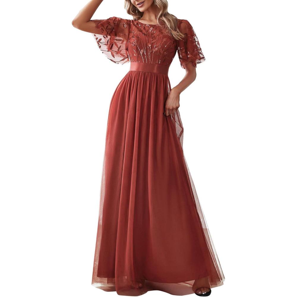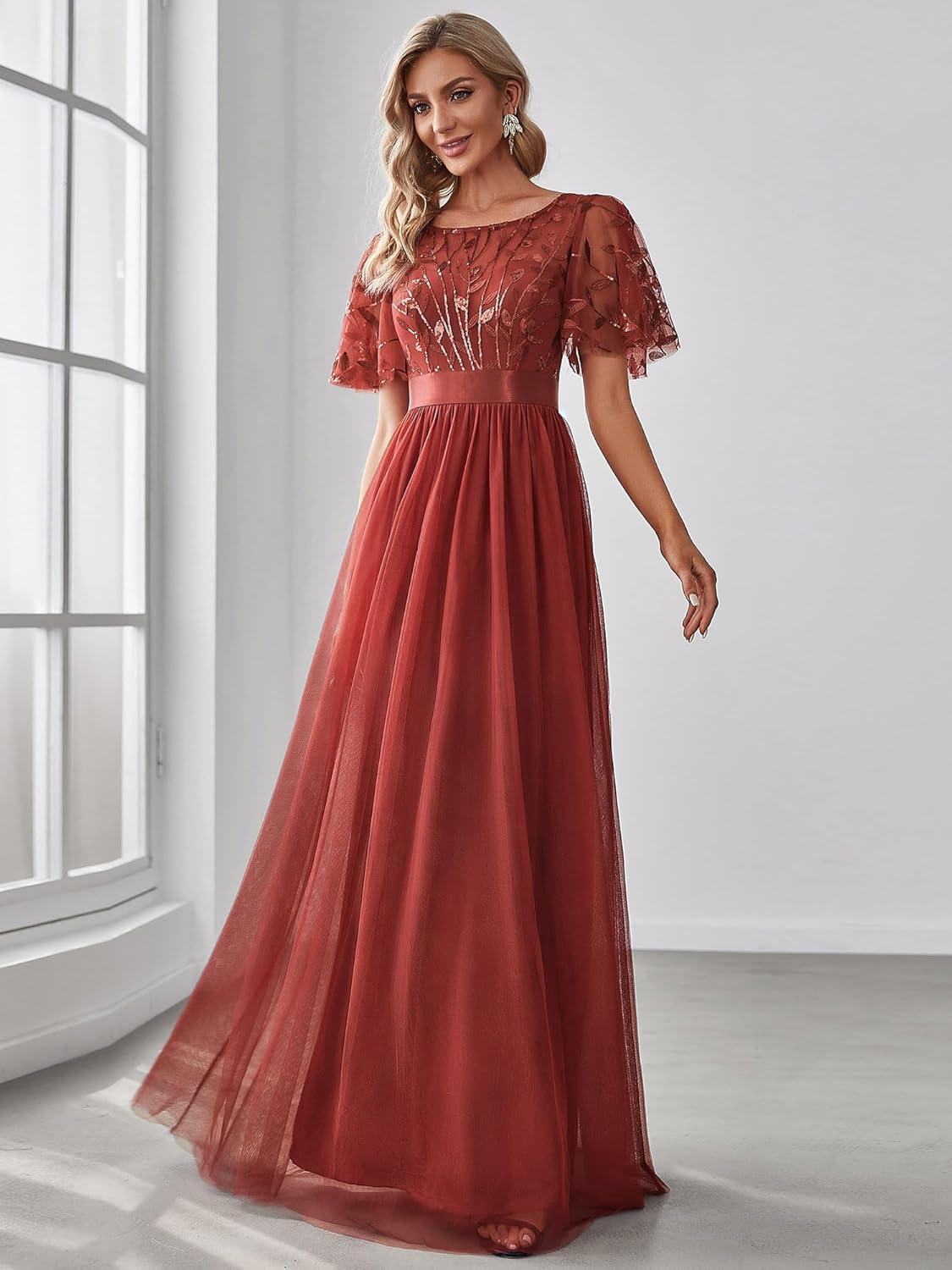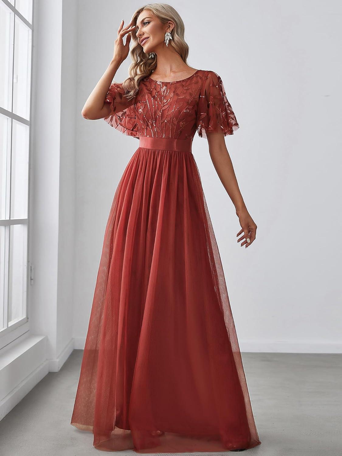 Ever-Pretty Women’s Elegant Crew Neck Sequin Ruffle Sleeve Empire Waist A-Line Long Formal Evening Dresses(Burnt Orange)