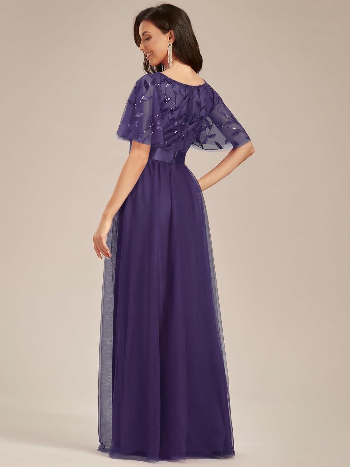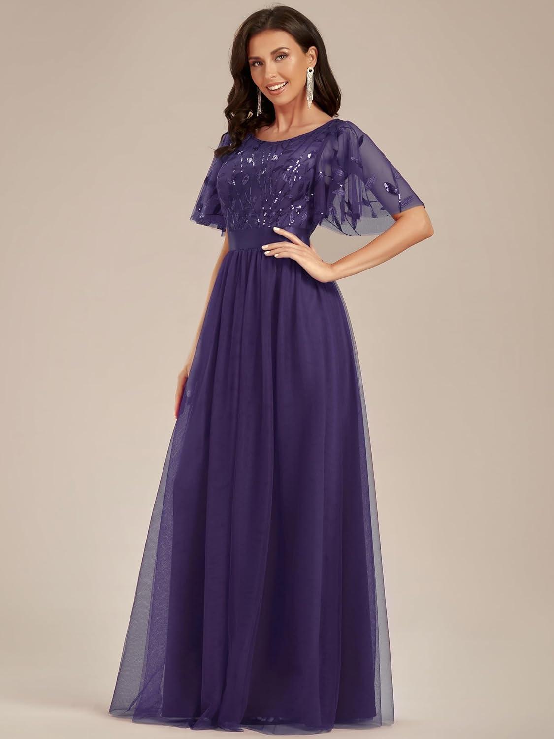 Ever-Pretty Women’s Elegant Crew Neck Sequin Ruffle Sleeve Empire Waist A-Line Long Formal Evening Dresses(Dark Purple)