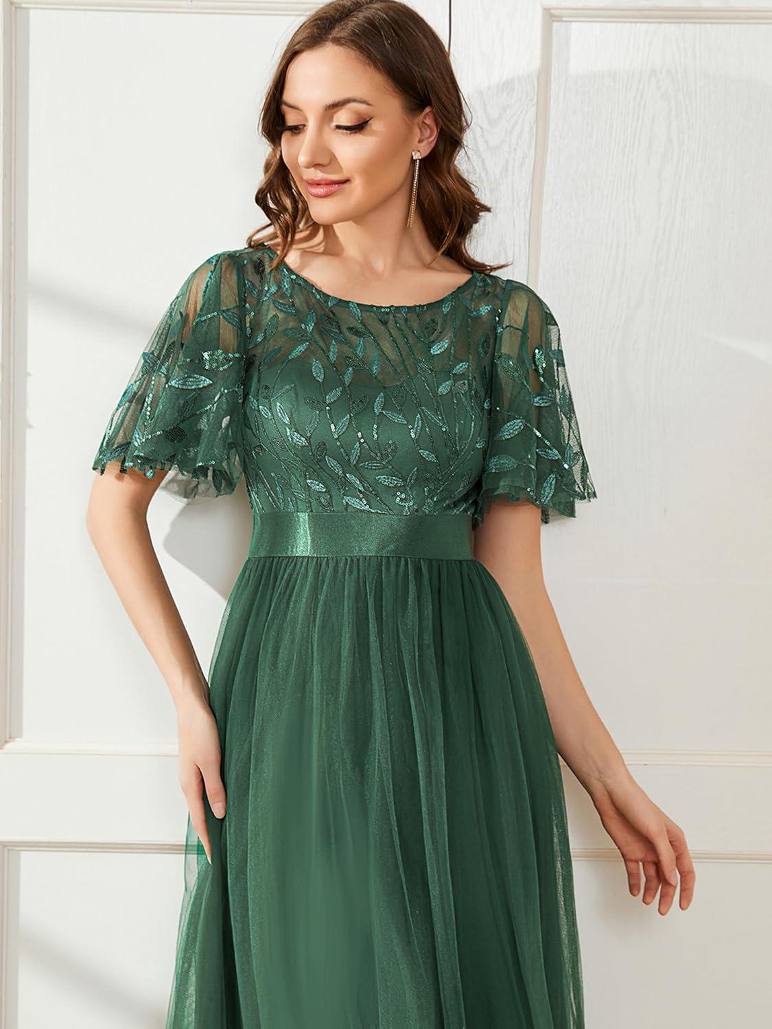 Ever-Pretty Women’s Elegant Crew Neck Sequin Ruffle Sleeve Empire Waist A-Line Long Formal Evening Dresses(Eucalyptus Green)