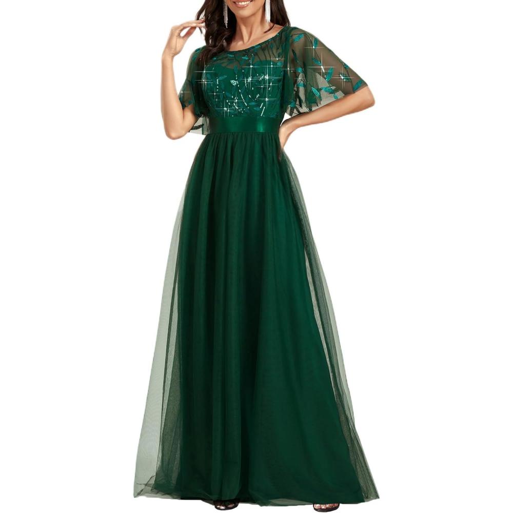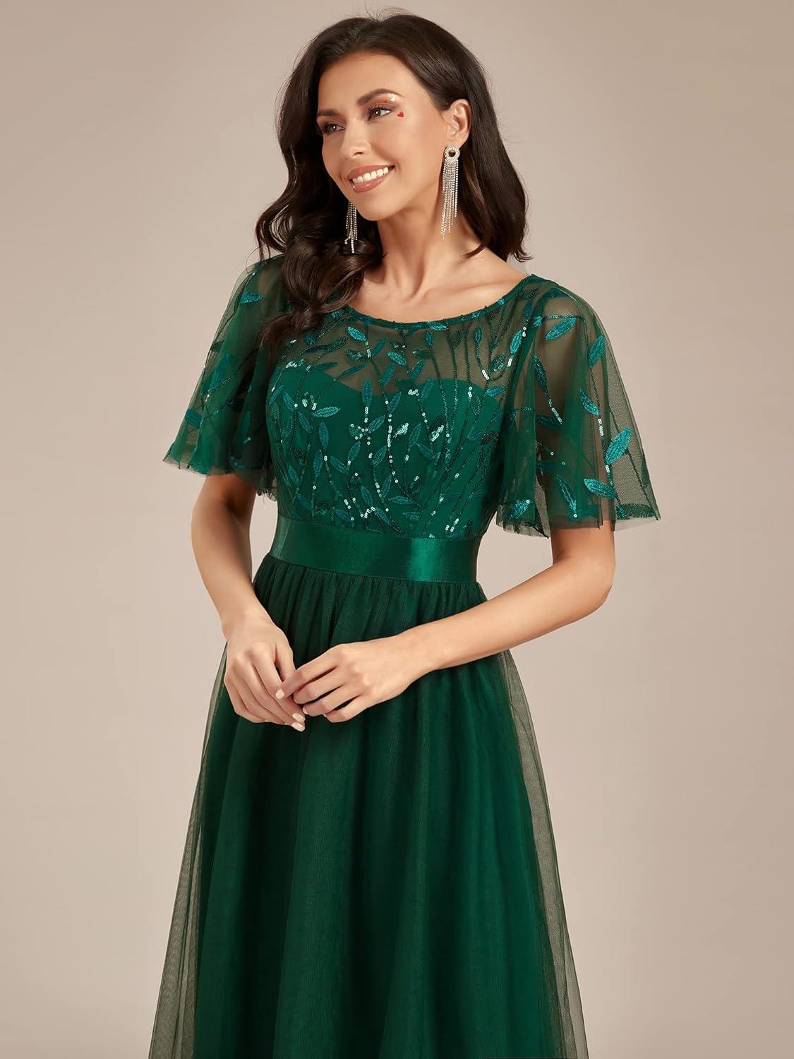 Ever-Pretty Women’s Elegant Crew Neck Sequin Ruffle Sleeve Empire Waist A-Line Long Formal Evening Dresses(Green)