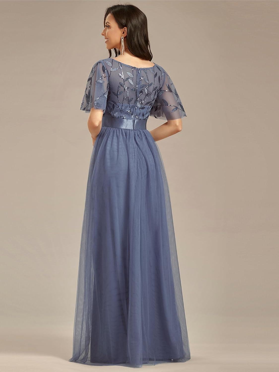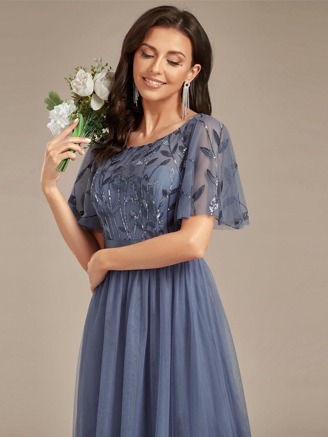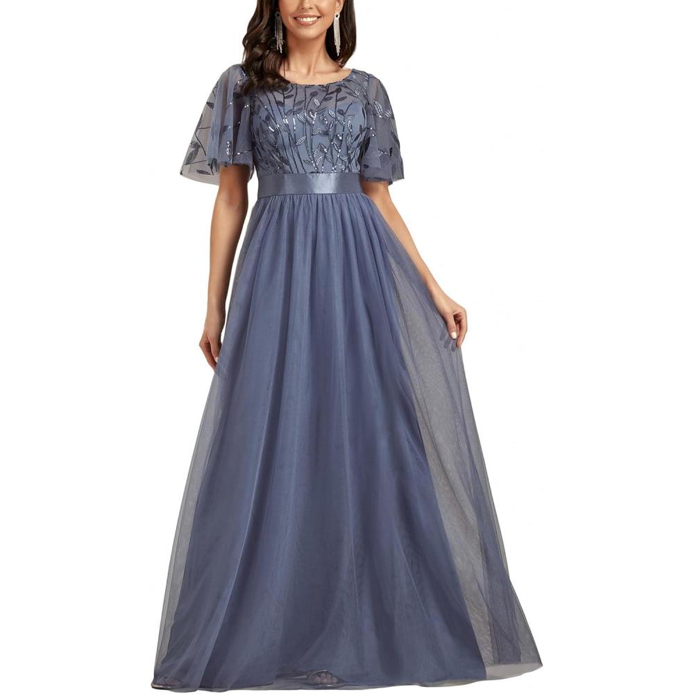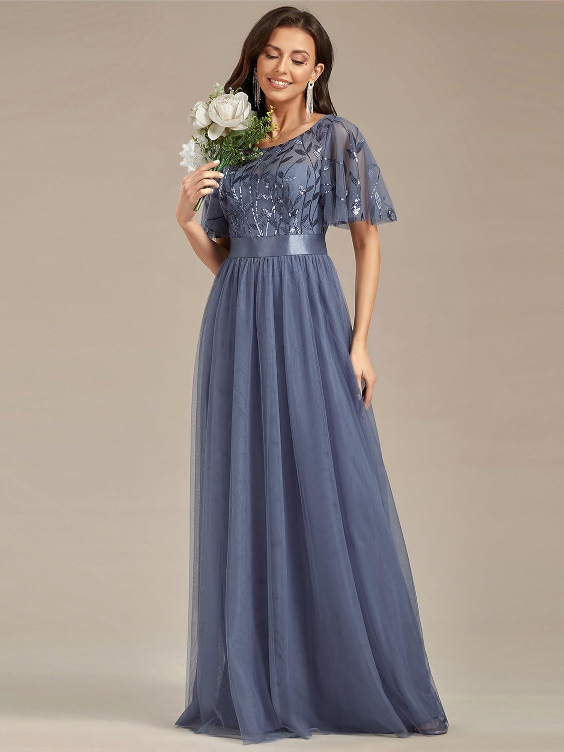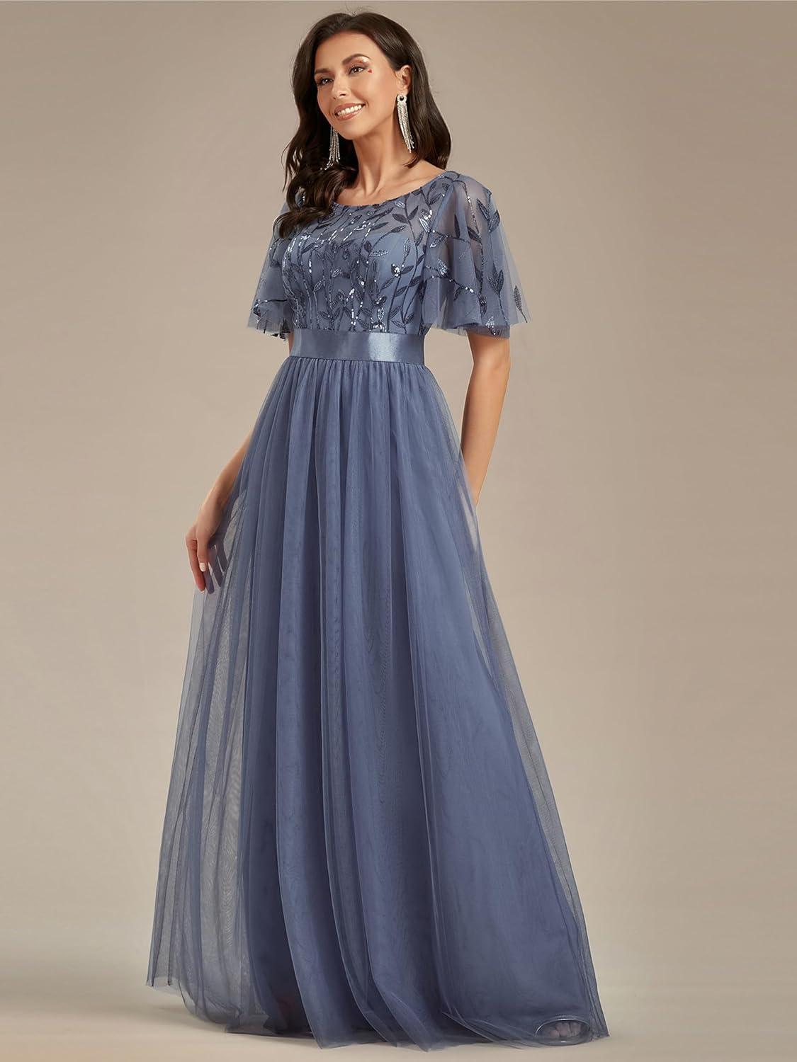 Ever-Pretty Women’s Elegant Crew Neck Sequin Ruffle Sleeve Empire Waist A-Line Long Formal Evening Dresses(Haze Blue)