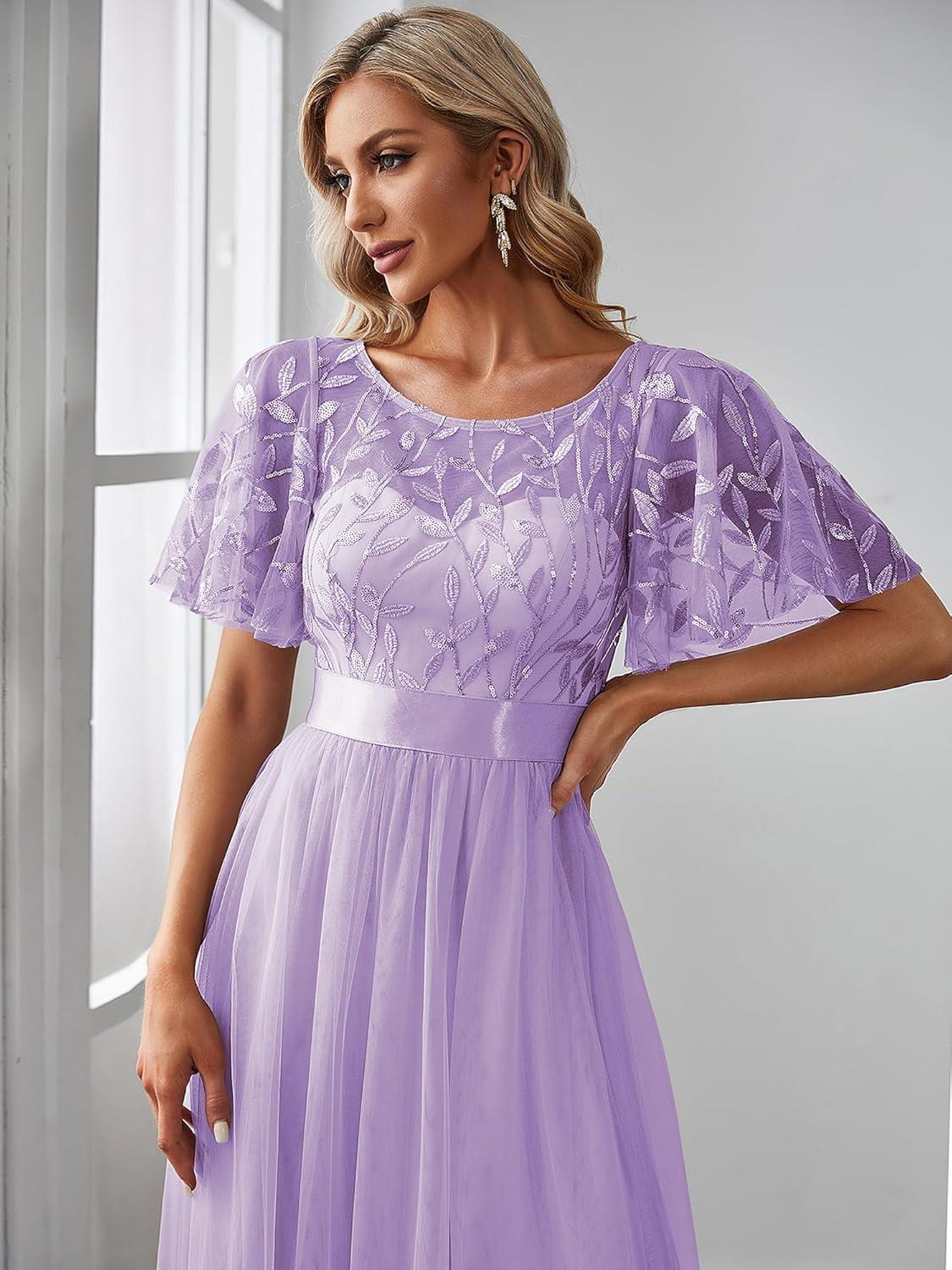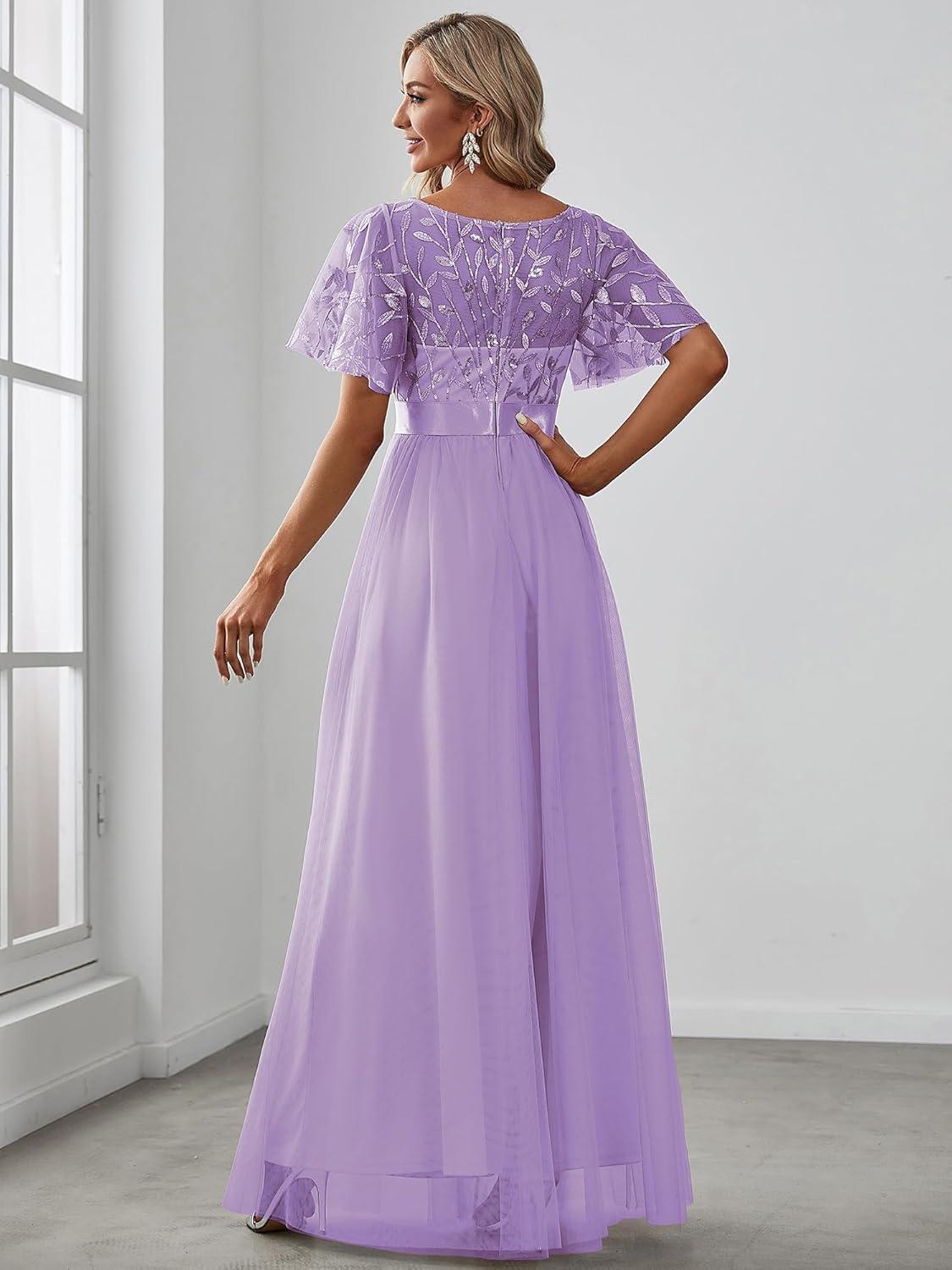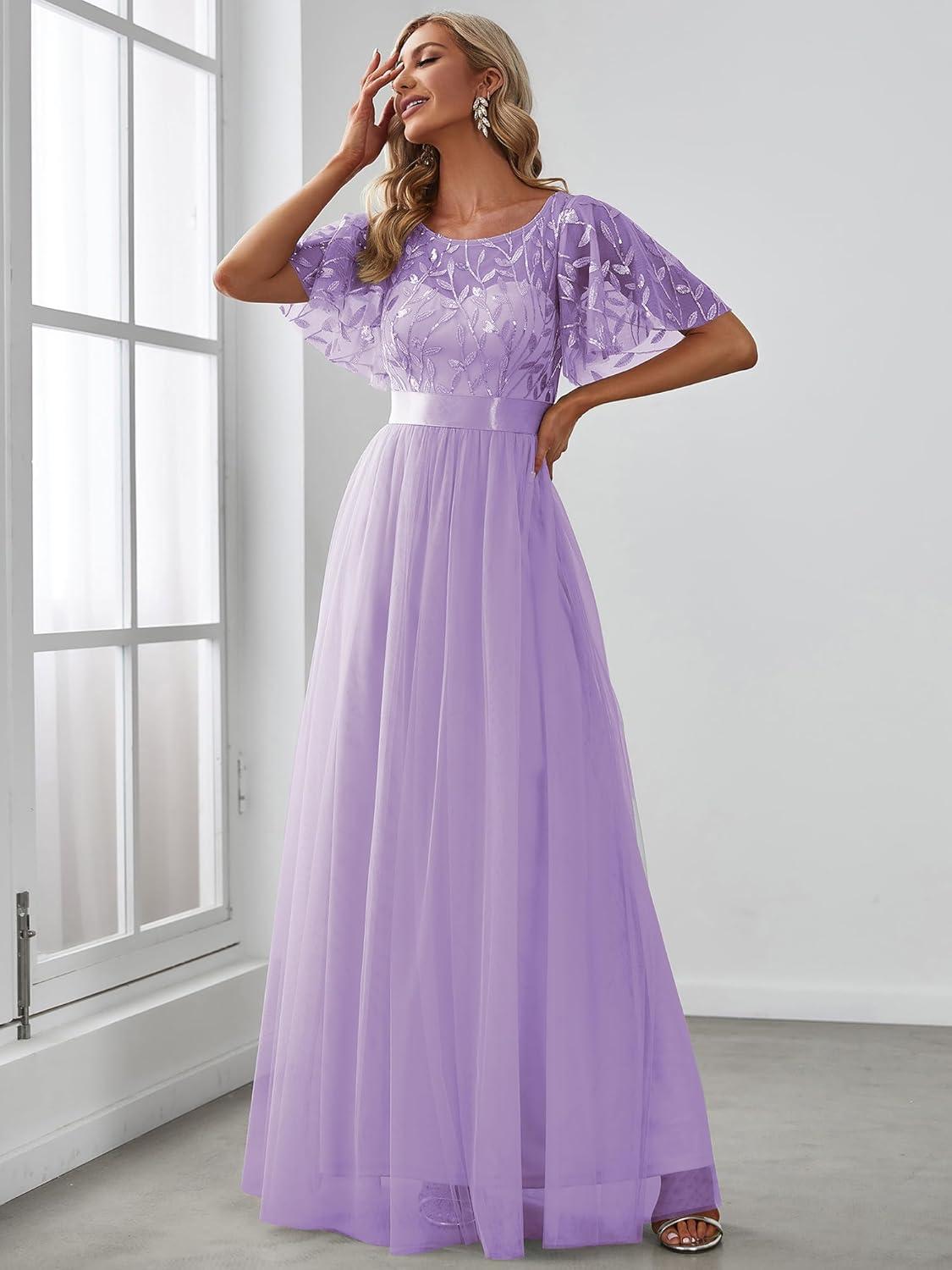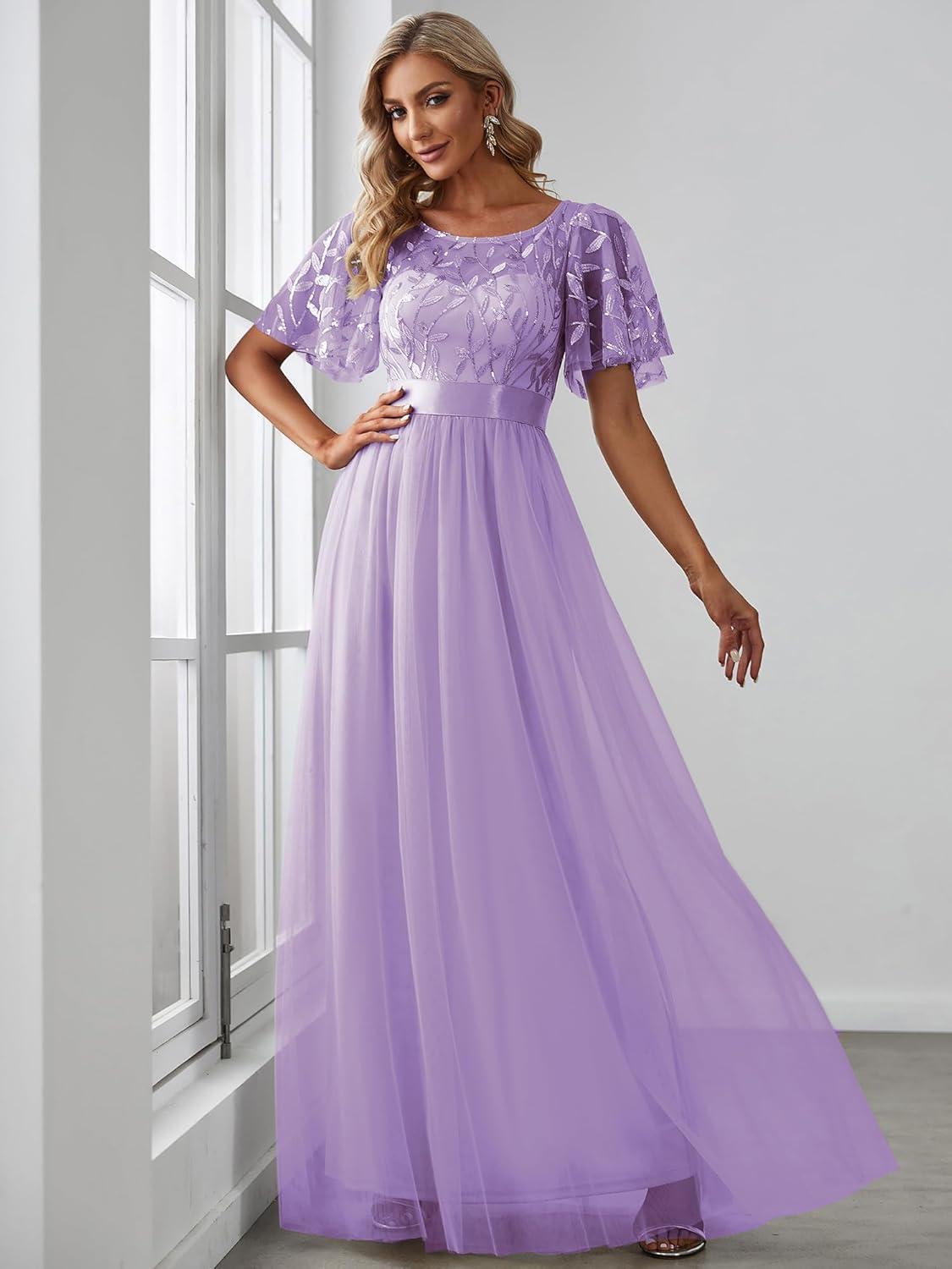 Ever-Pretty Women’s Elegant Crew Neck Sequin Ruffle Sleeve Empire Waist A-Line Long Formal Evening Dresses(Lavender)