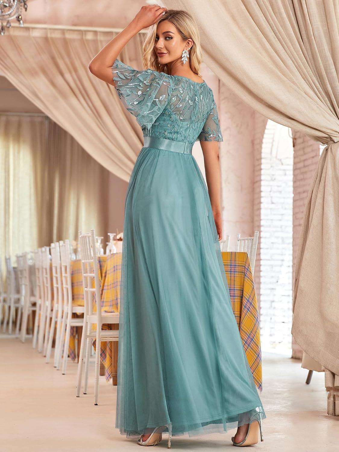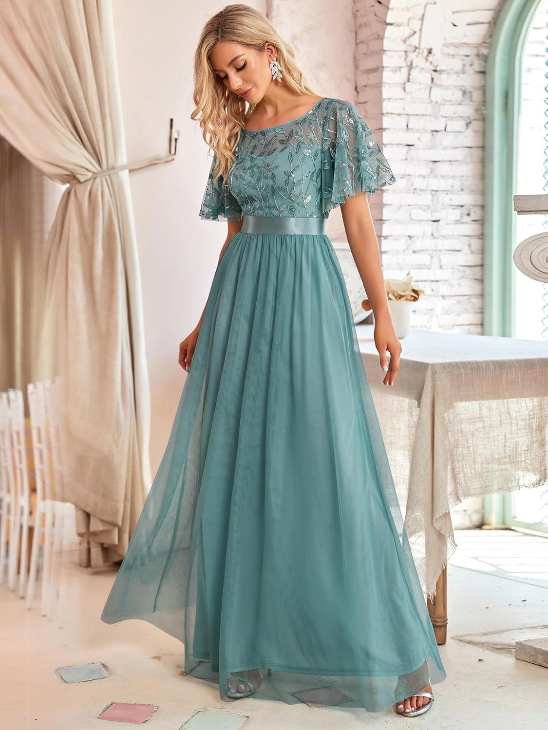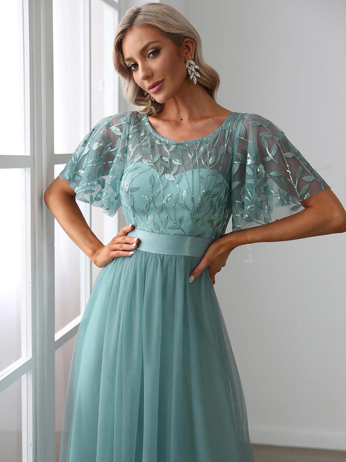 Ever-Pretty Women’s Elegant Crew Neck Sequin Ruffle Sleeve Empire Waist A-Line Long Formal Evening Dresses(Mint)