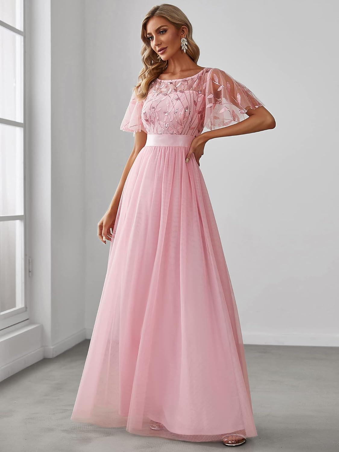 Ever-Pretty Women’s Elegant Crew Neck Sequin Ruffle Sleeve Empire Waist A-Line Long Formal Evening Dresses(Pink)