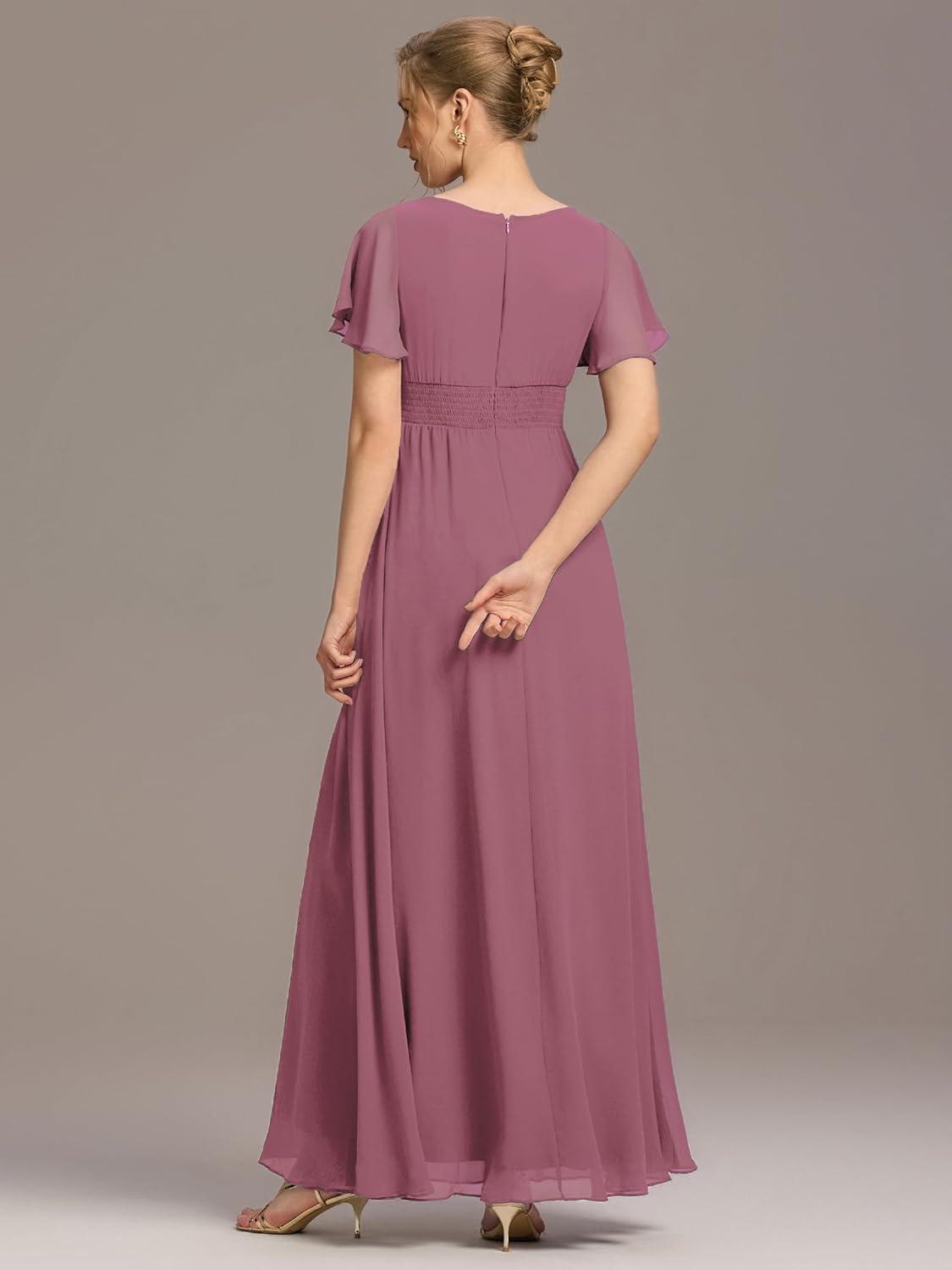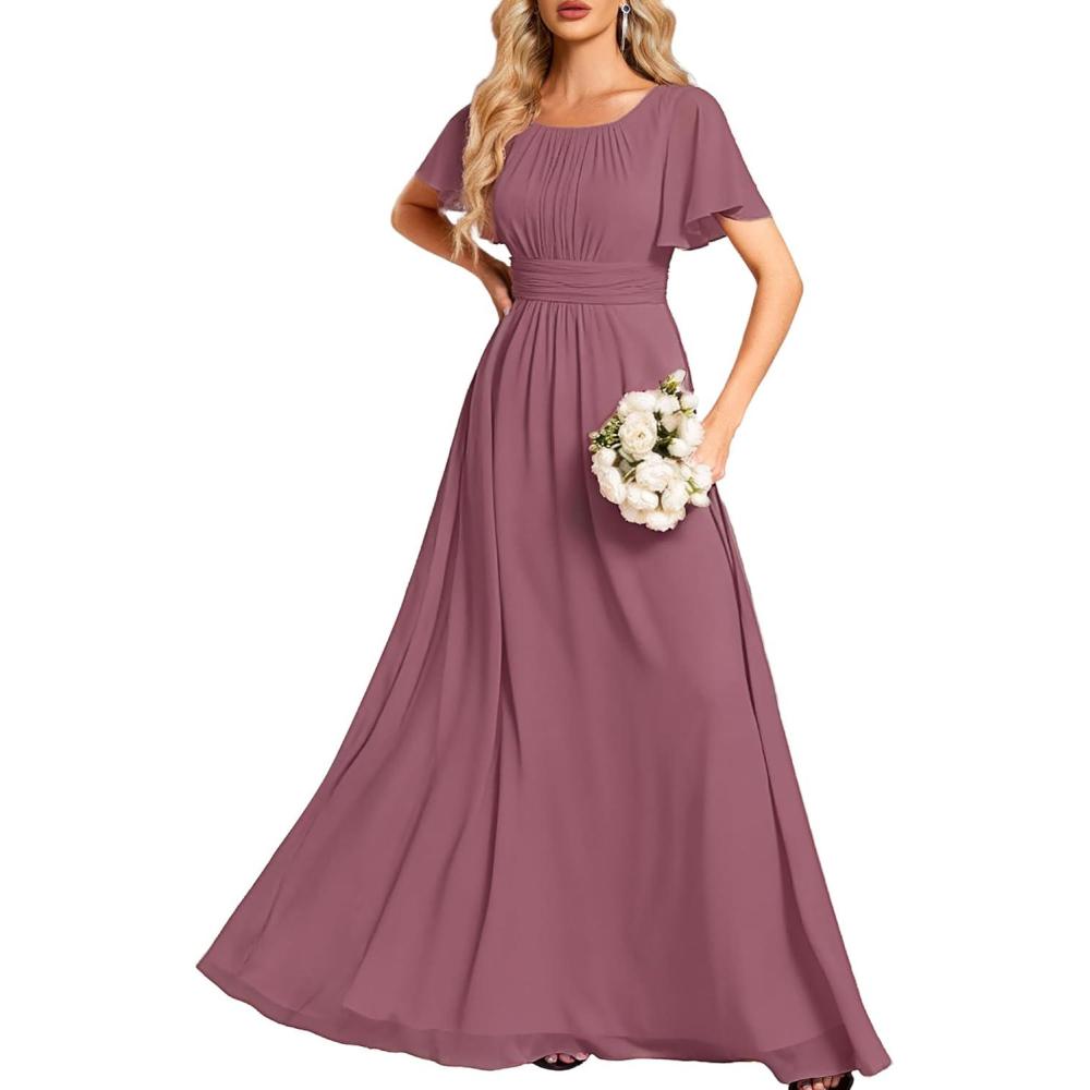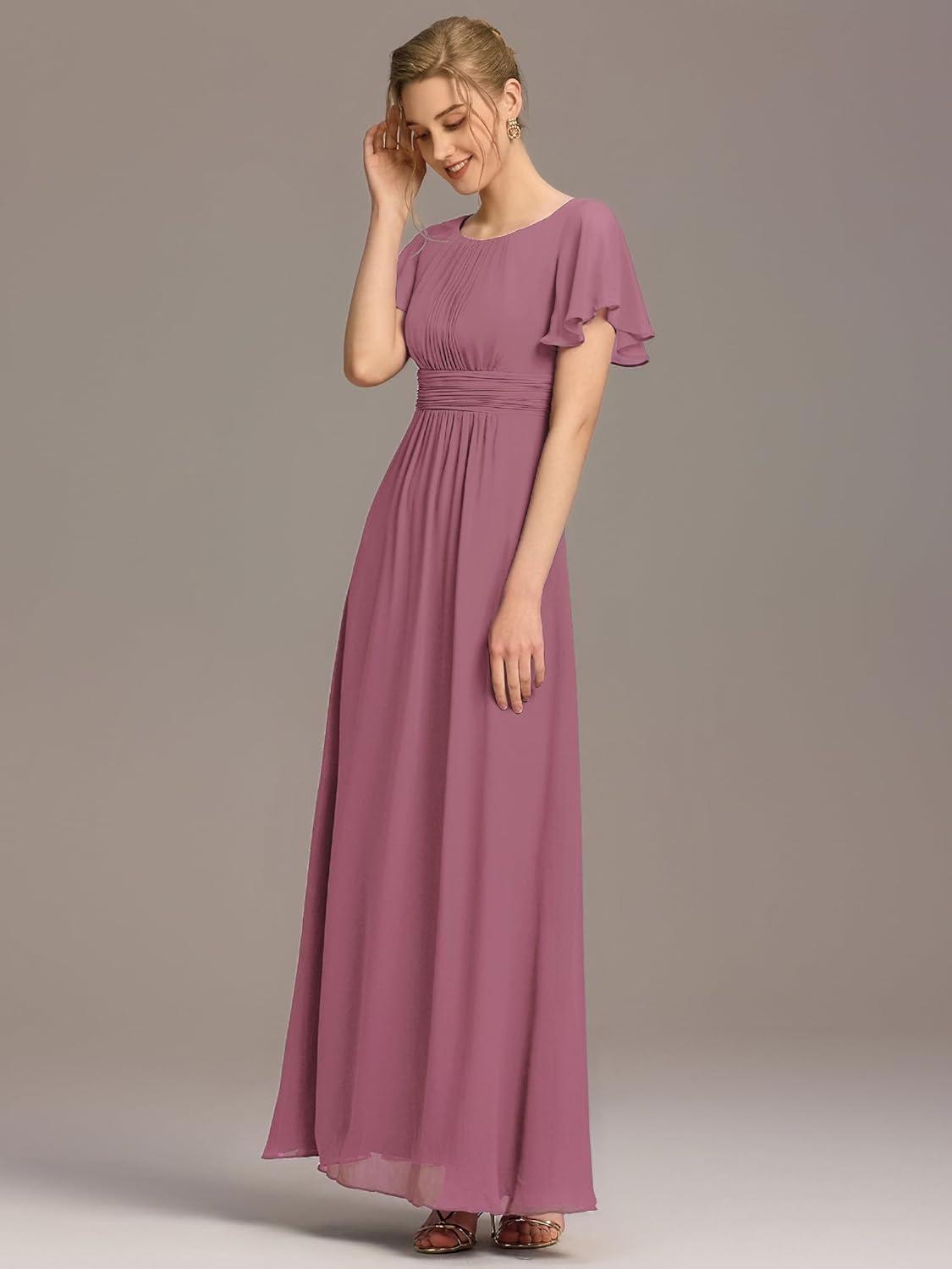 Ever-Pretty Women’s Elegant Round Neck Short Sleeves Chiffon Empire Waist Floor Length Formal Bridesmaid Dress 01840-PH(Pink)
