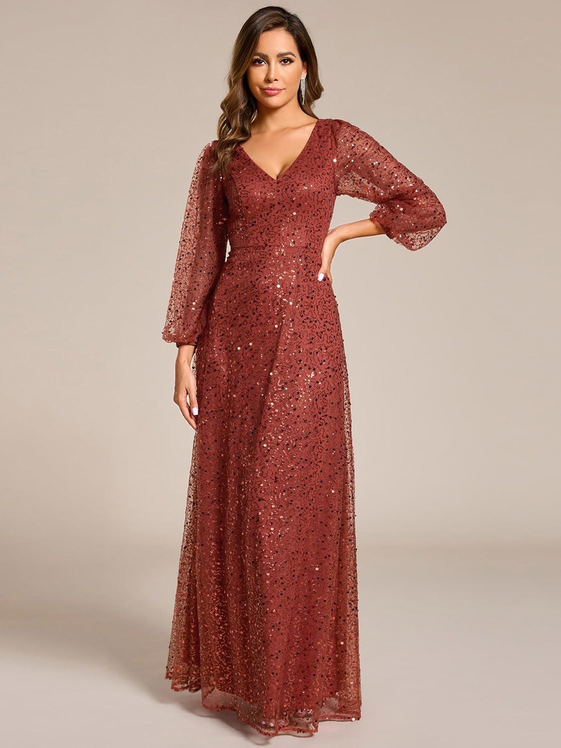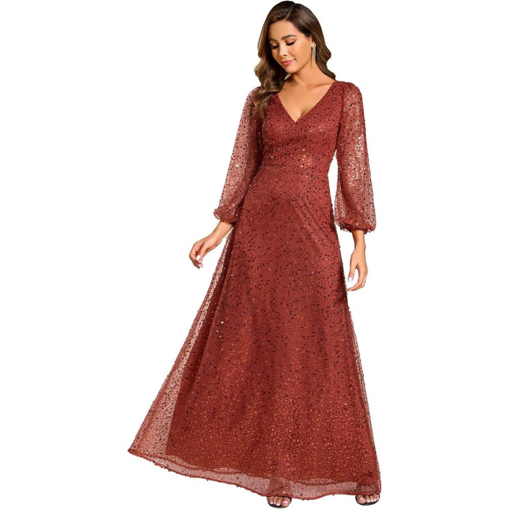 Ever-Pretty Women’s Elegant V Neck A-Line Floor Length Long Sleeves Sparkly Sequin Formal Dress 01999(Burnt Orange)