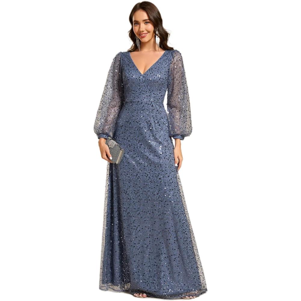 Ever-Pretty Women's Elegant V Neck A-Line Floor Length Long Sleeves Sparkly Sequin Formal Dress 01999(Dusty Blue)