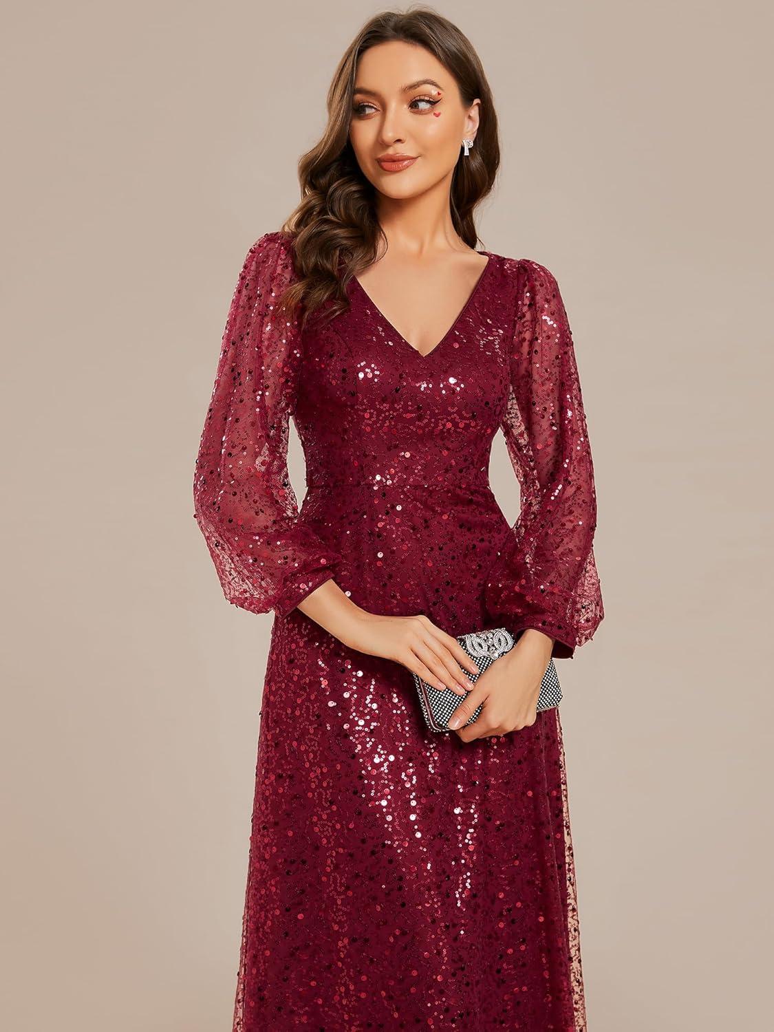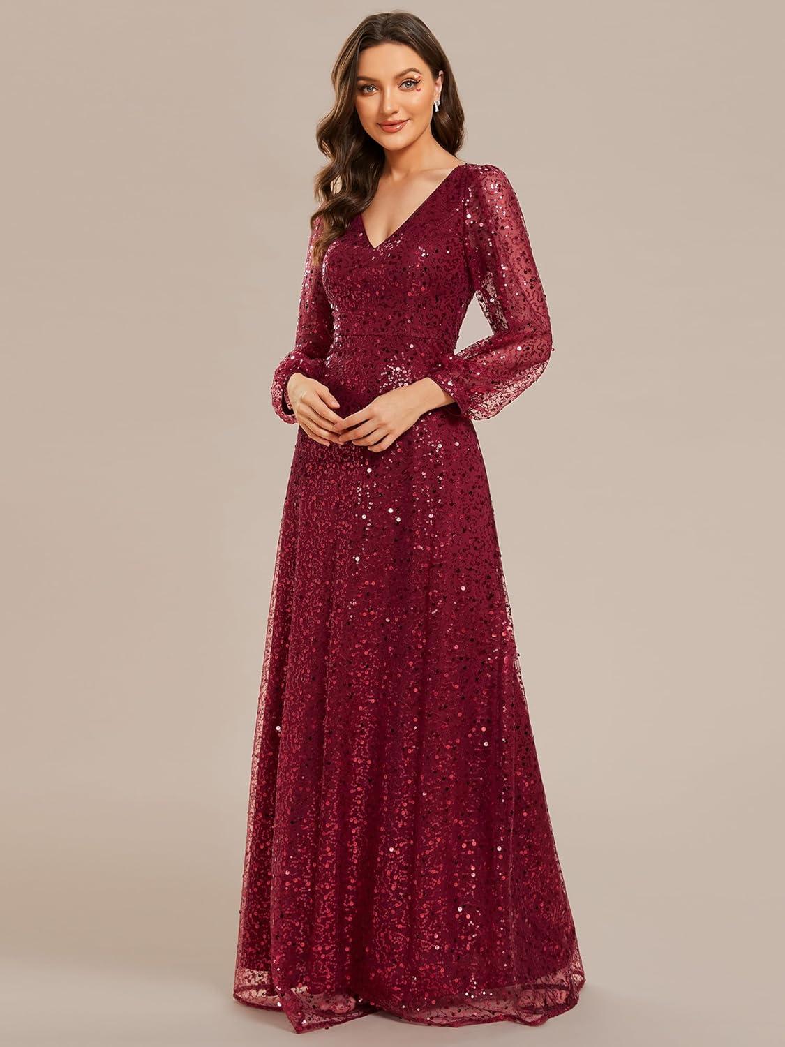 Ever-Pretty Women’s Elegant V Neck A-Line Floor Length Long Sleeves Sparkly Sequin Formal Evening Dress 01999(Burgundy)