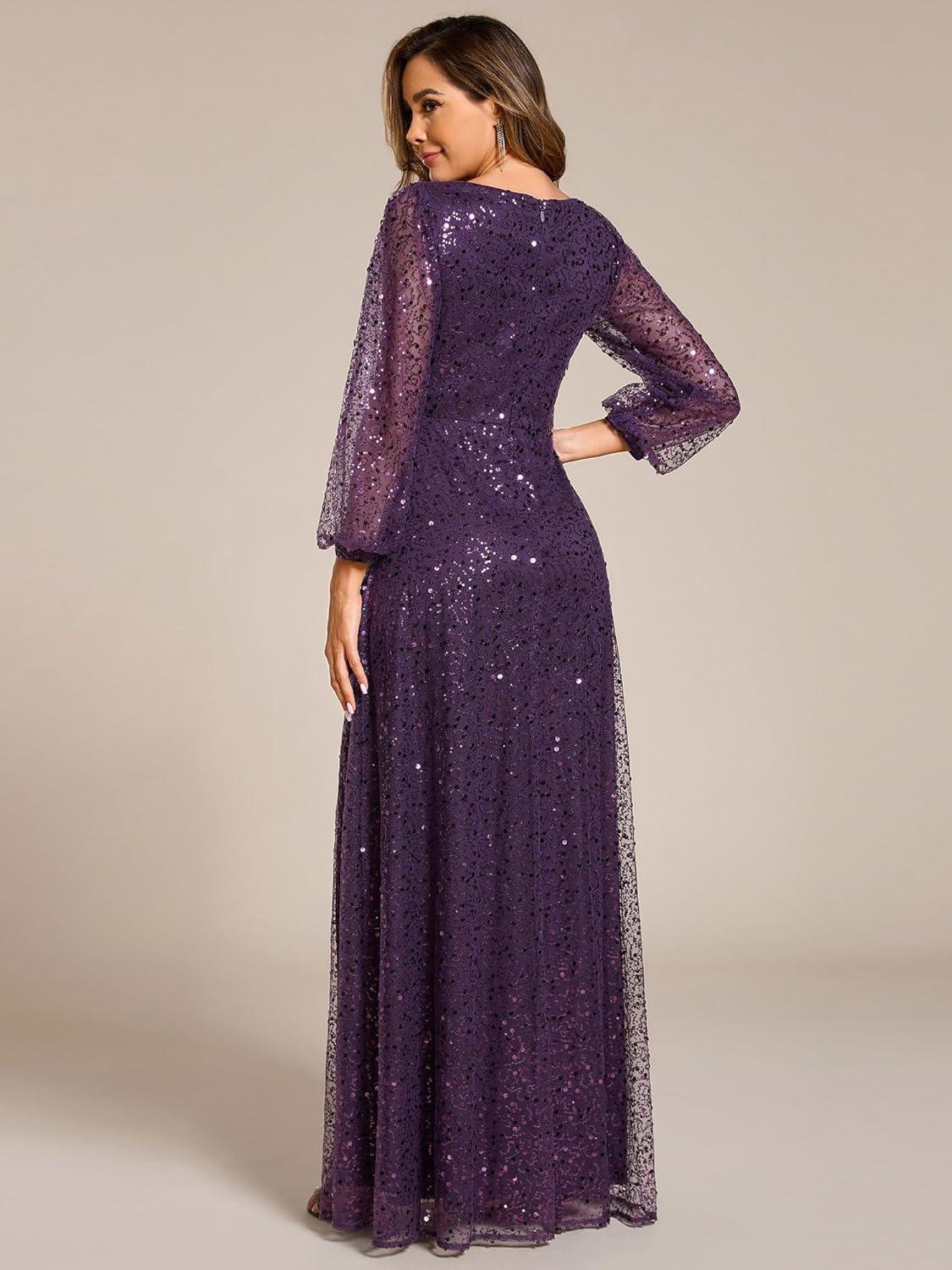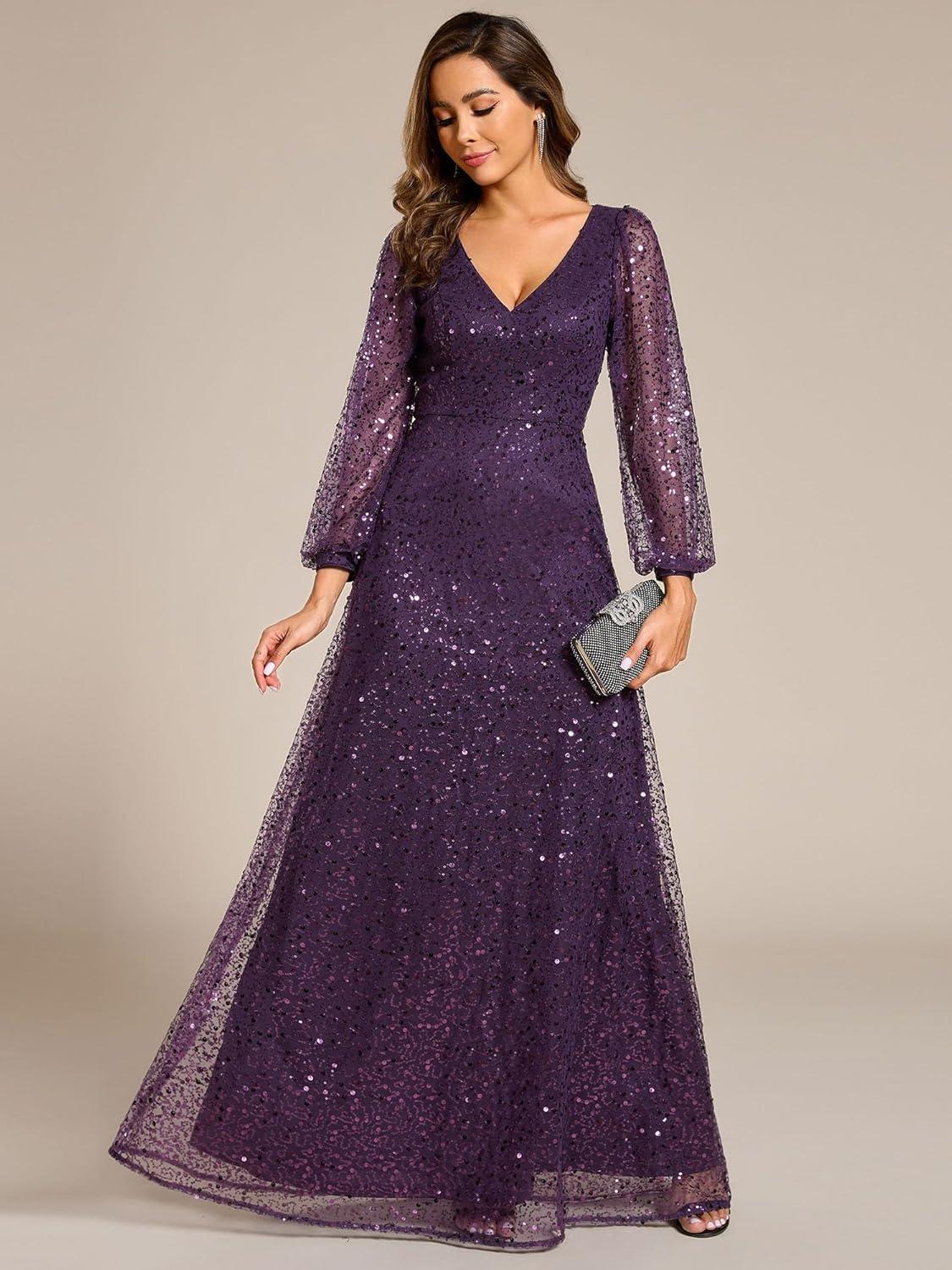 Ever-Pretty Women’s Elegant V Neck A-Line Floor Length Long Sleeves Sparkly Sequin Formal Evening Dress 01999(Dark Purple)