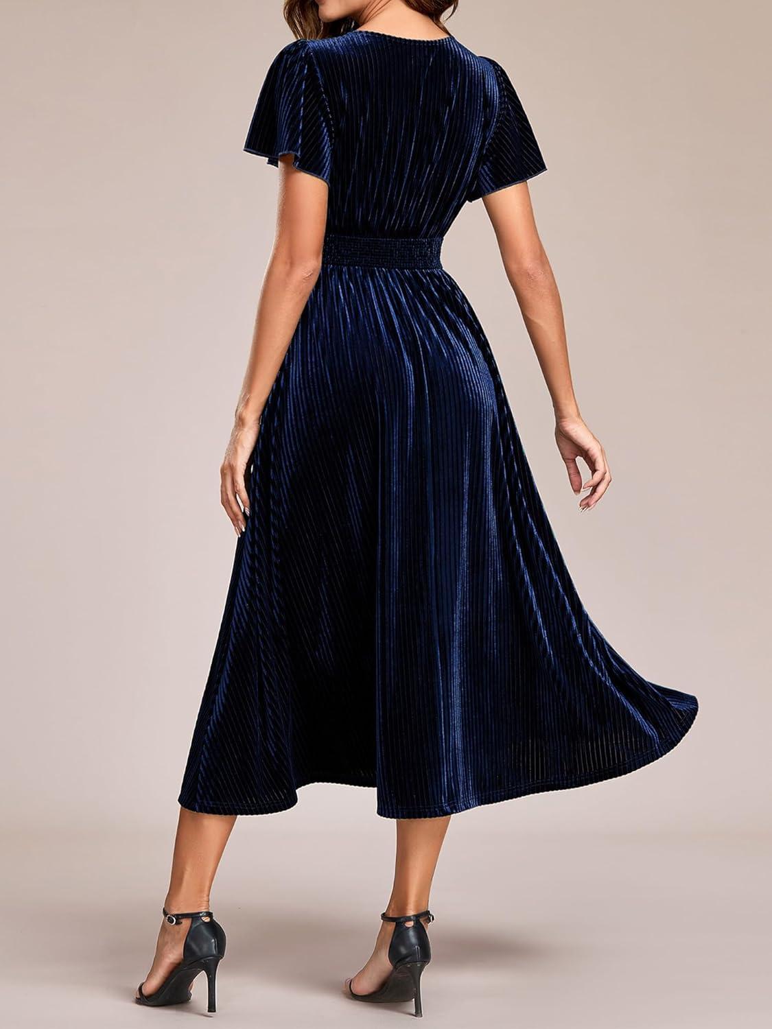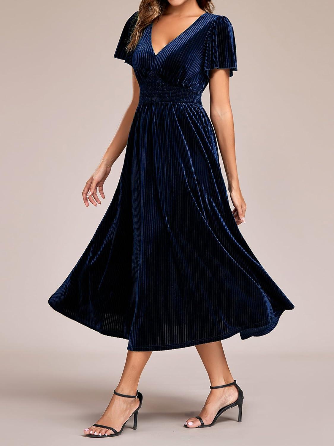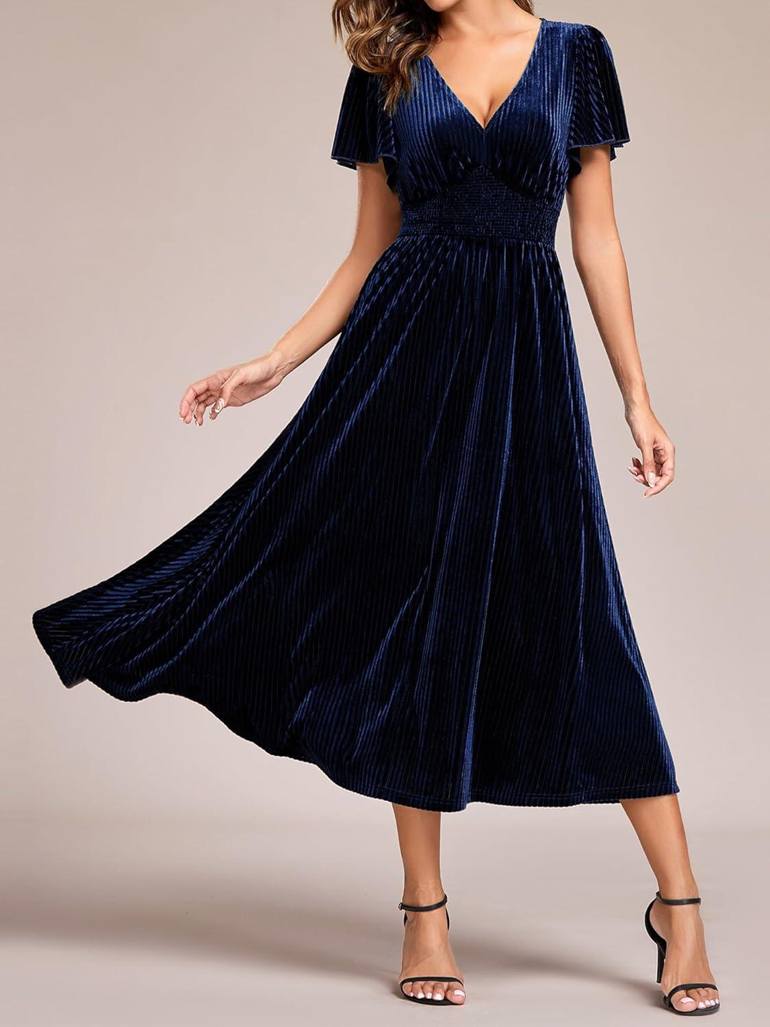 Ever-Pretty Women’s Elegant Velvet A-Line Short Ruffles Sleeves Formal Dress(Navy Blue)