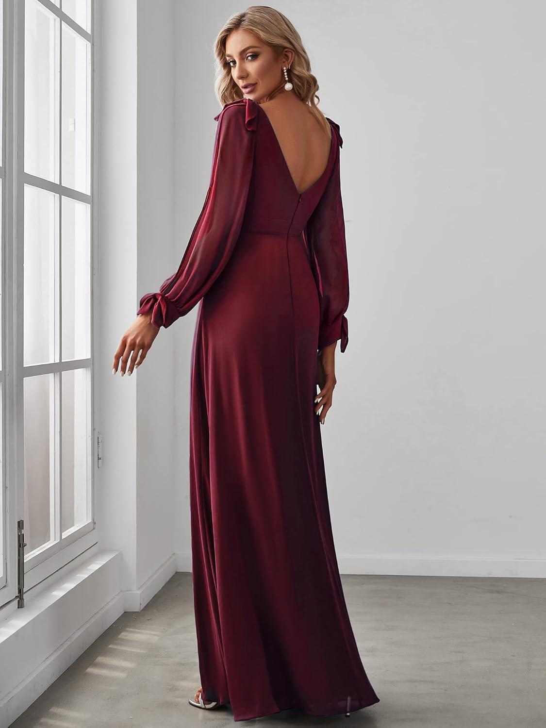 Ever-Pretty Women's Fall Winter Elegant Long Sleeves V Neck High Waist Split Chiffon Floor Length Formal Dress 80116(Burgundy)
