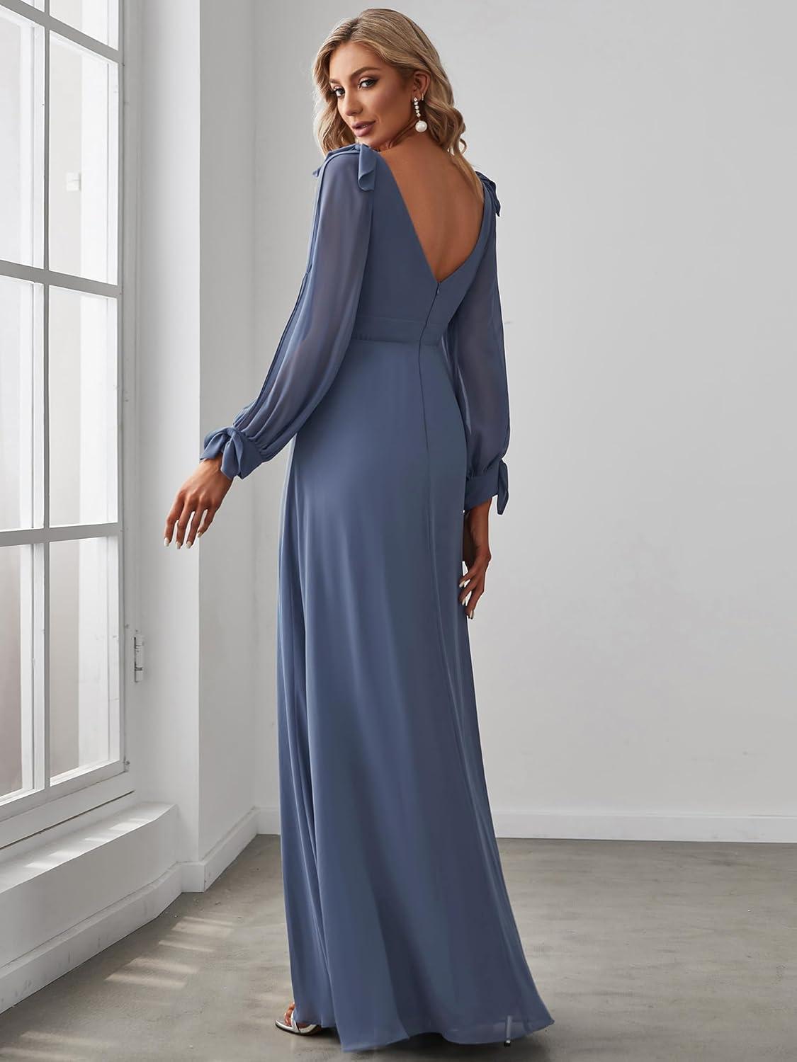 Ever-Pretty Women's Fall Winter Elegant Long Sleeves V Neck High Waist Split Chiffon Floor Length Formal Dress 80116(Haze Blue)