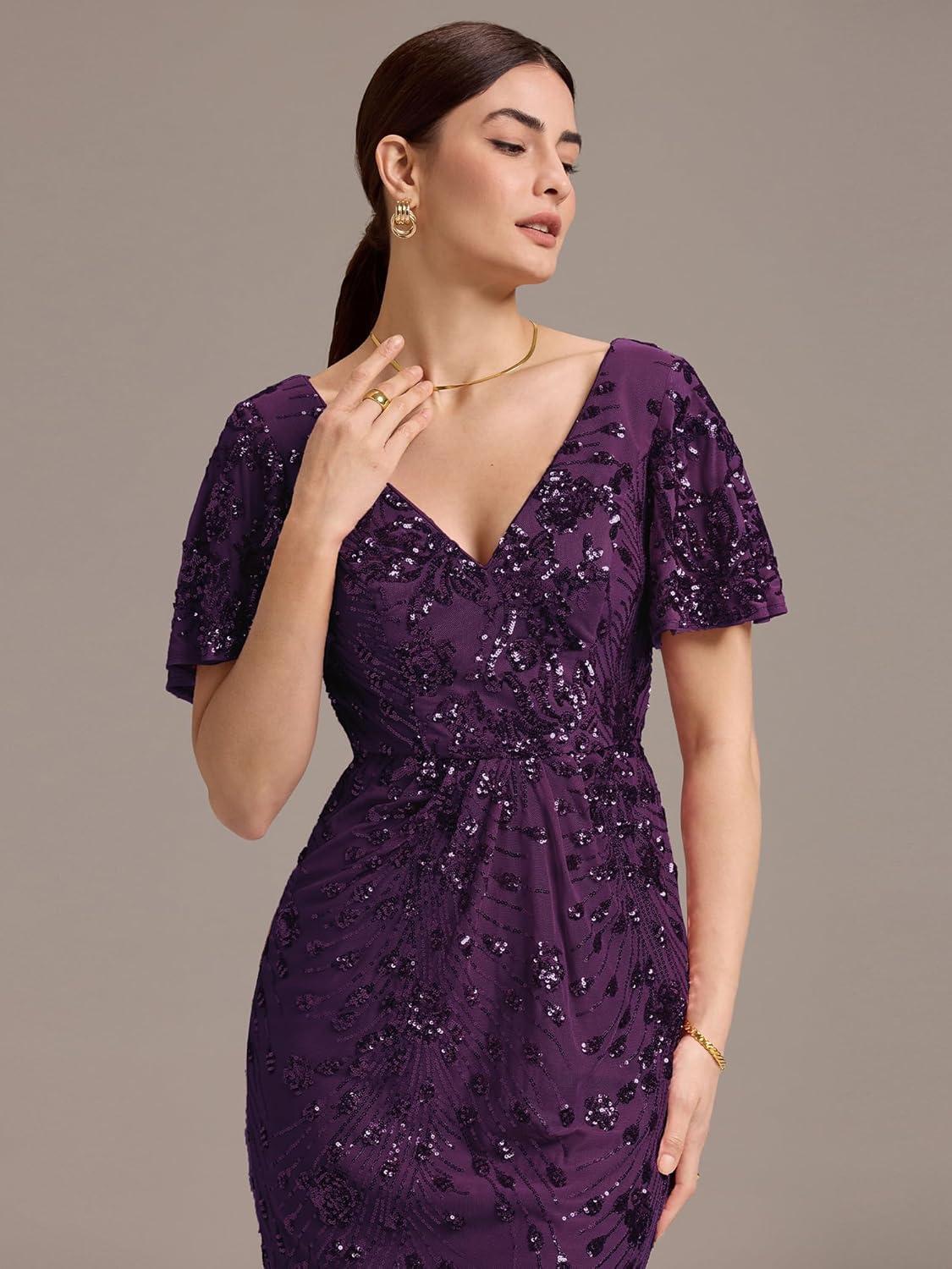 Get up to 50% off on Ever-Pretty Women’s Gorgeous V Neck Sequin Tulle Short Sleeves Bodycon Maxi Formal Evening Gowns 02370(Purple) styles during our spring sale event.