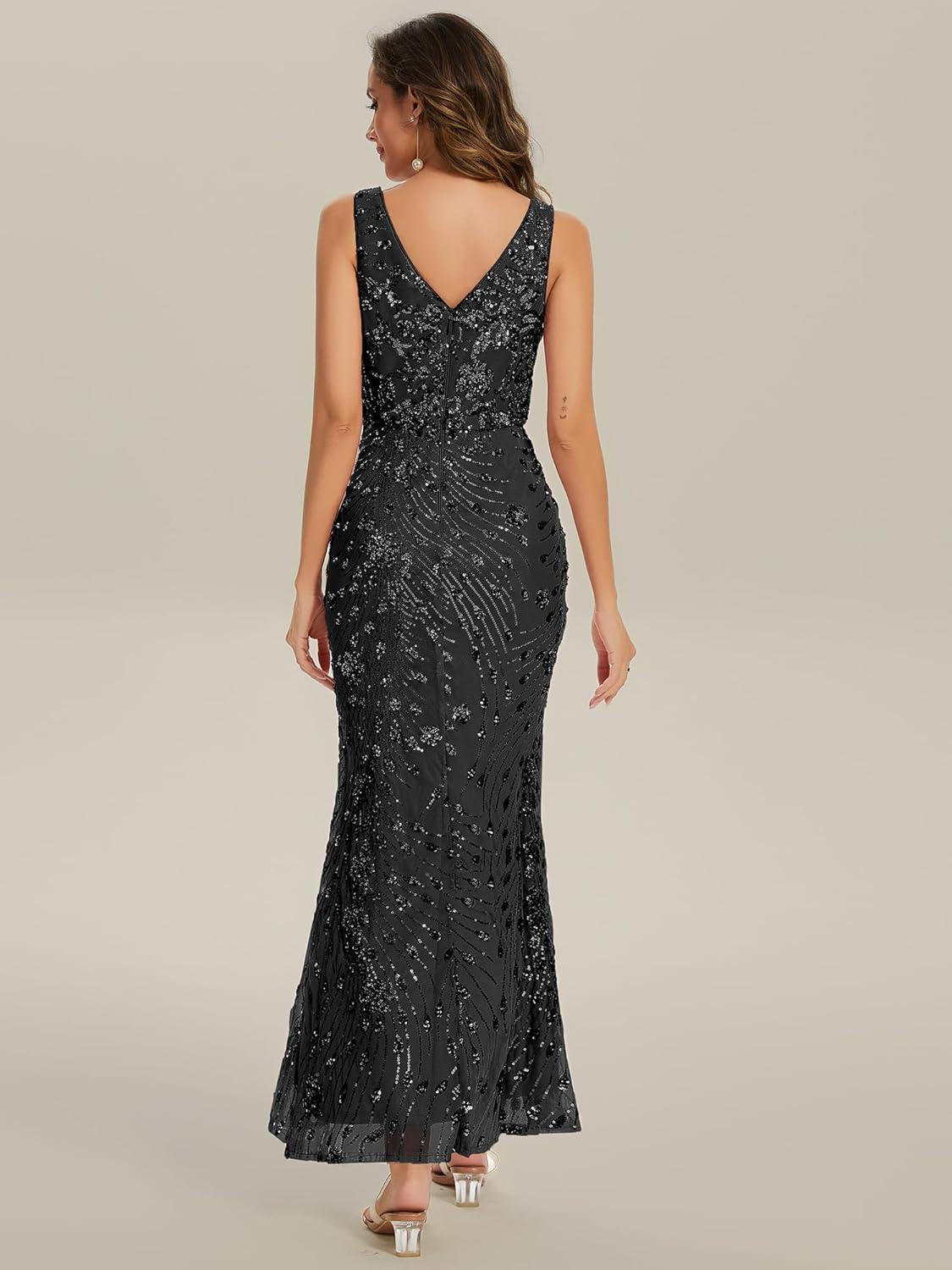 Ever-Pretty Women’s Sequin Embroidered V Neck Slit Sleeveless Bodycon Maxi Evening Gown 02548(Black)