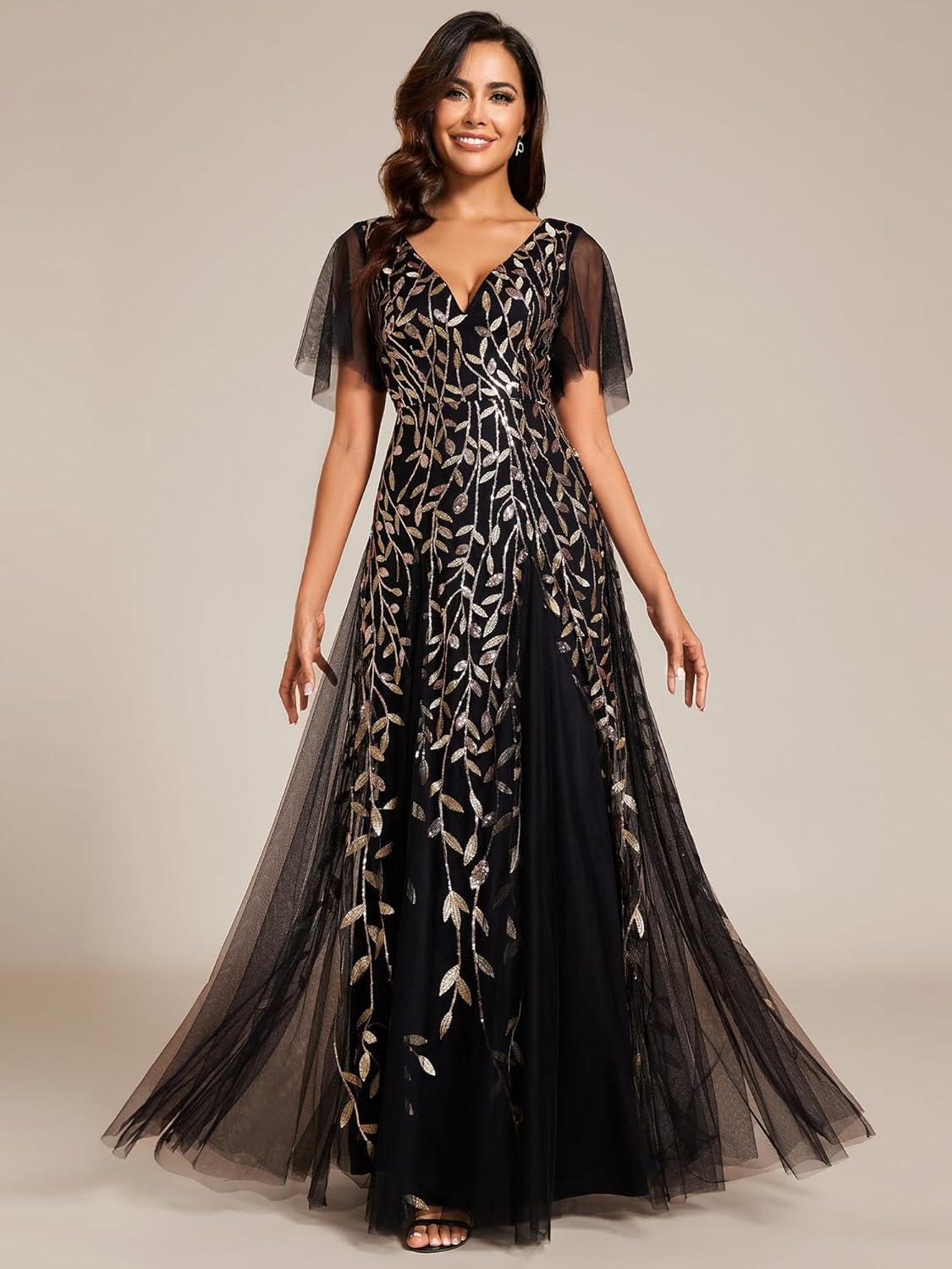 Ever-Pretty Women’s Sequin Sparkly V-Neck Short Sleeve A-Line Floor Length Formal Evening Dress(Black Gold)