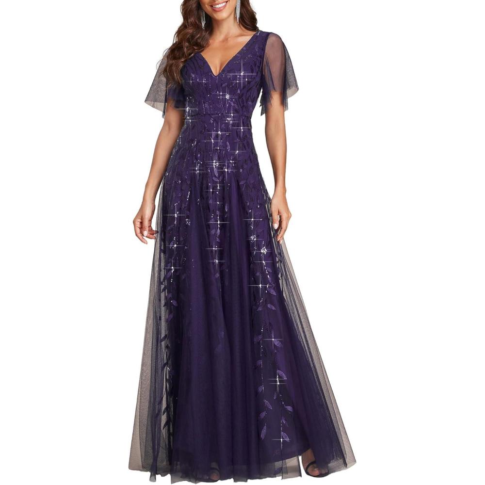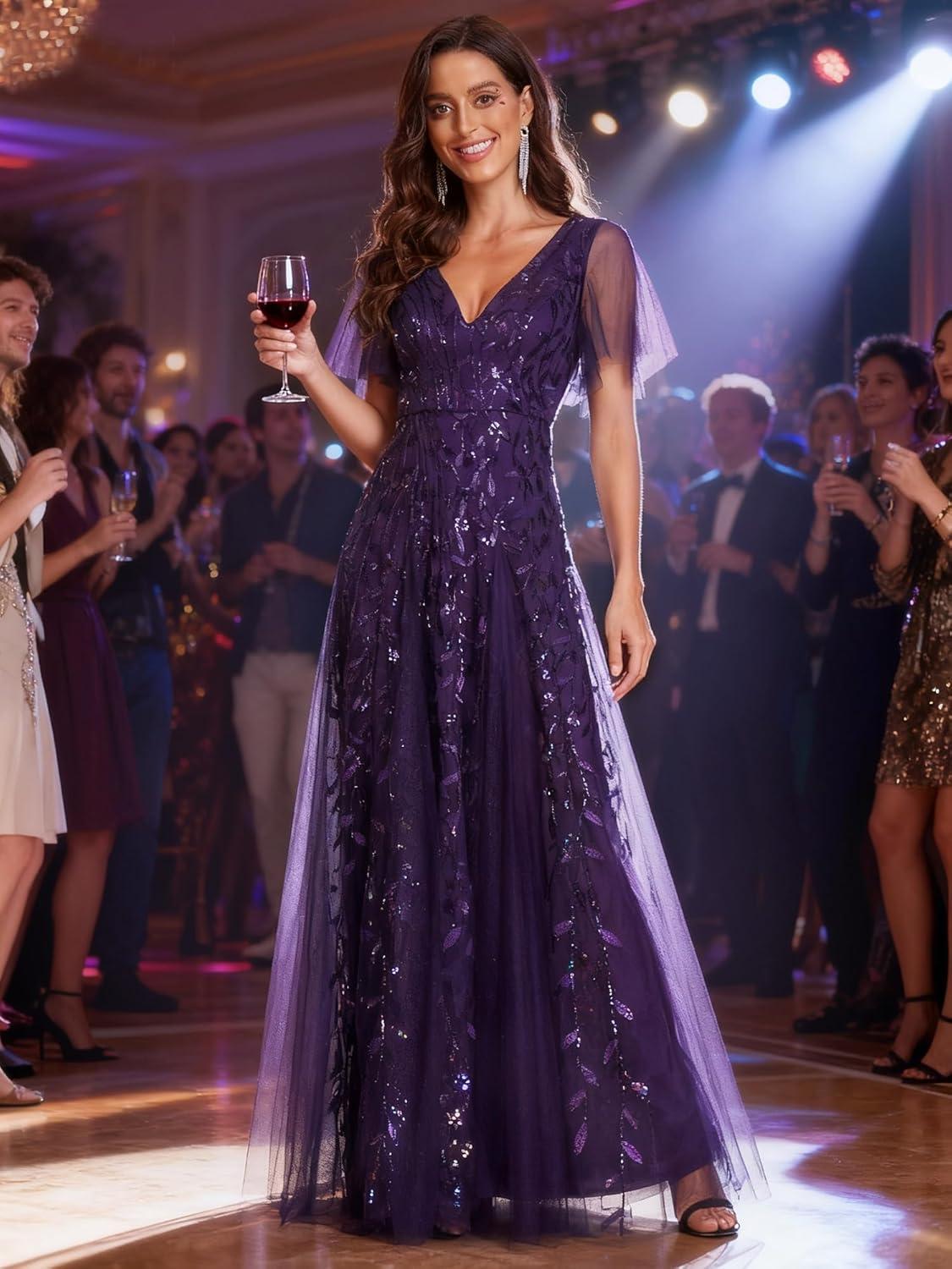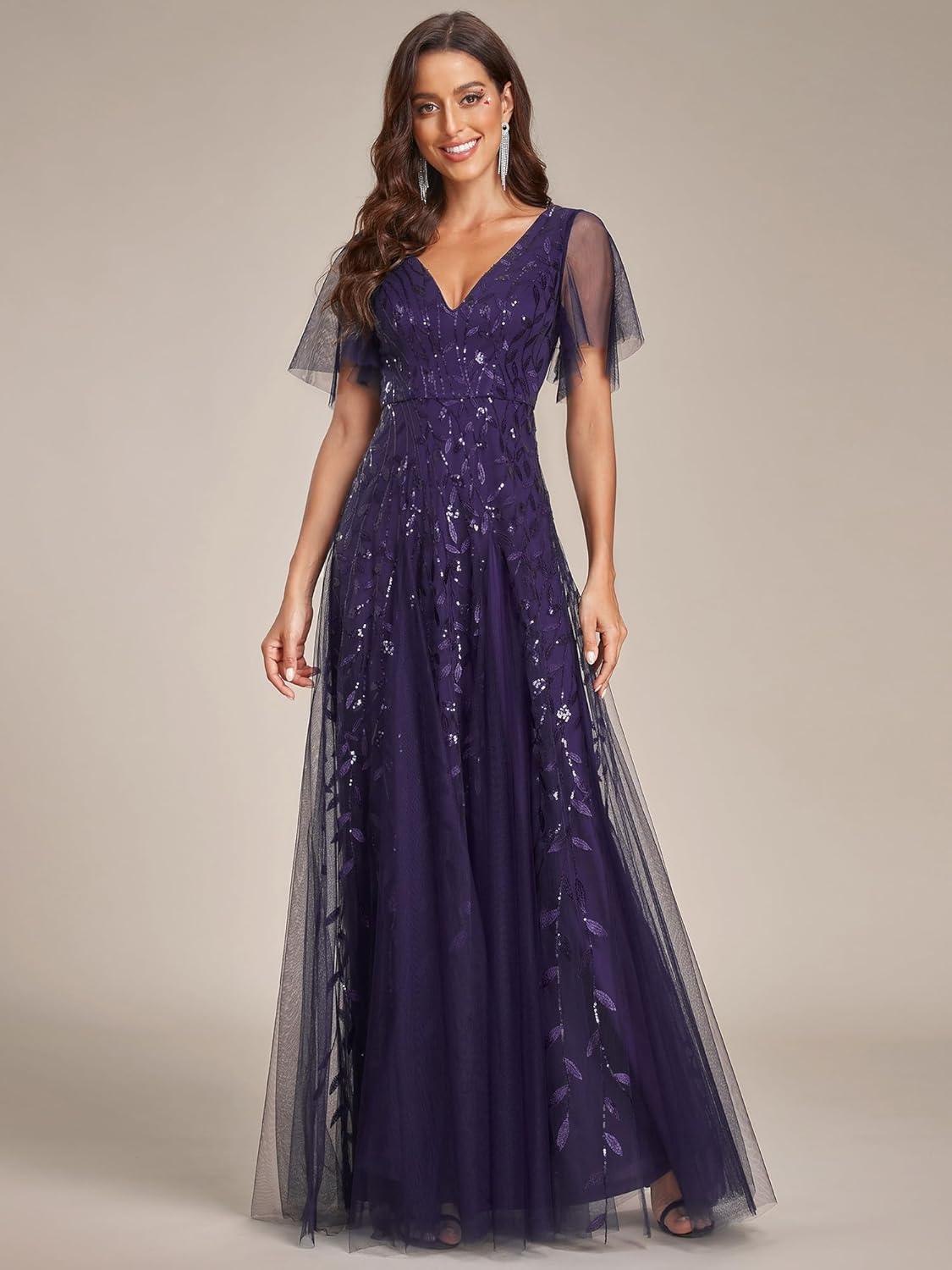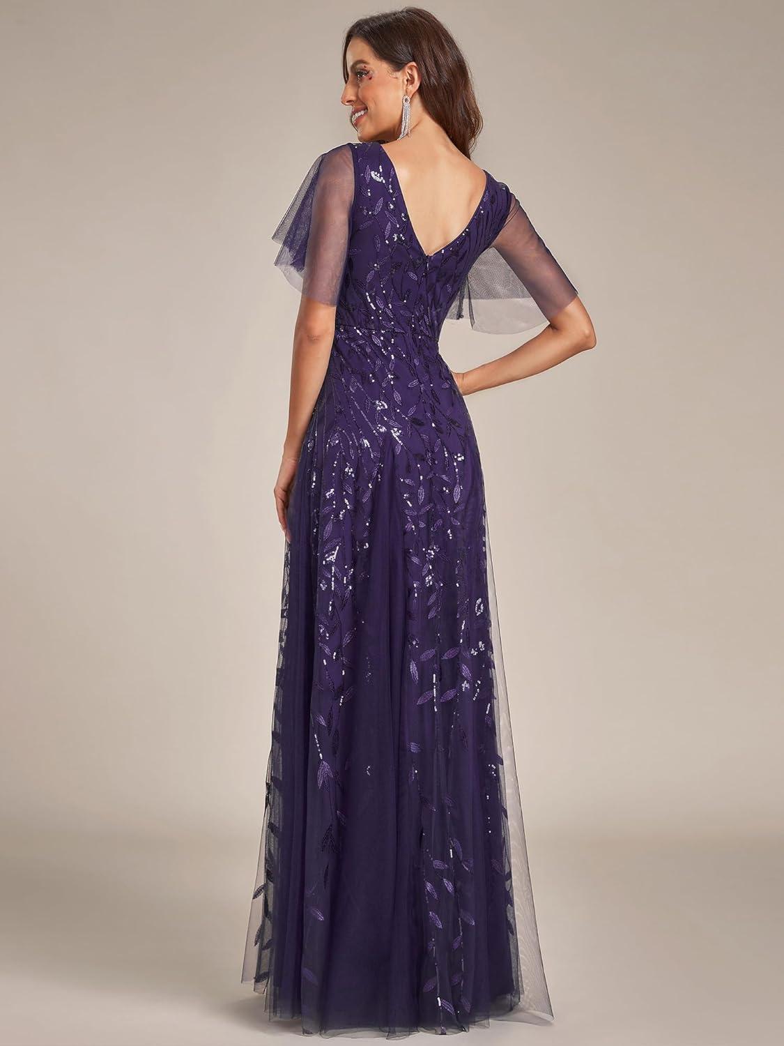 Ever-Pretty Women’s Sequin Sparkly V-Neck Short Sleeve A-Line Floor Length Formal Evening Dress(Deep Purple)
