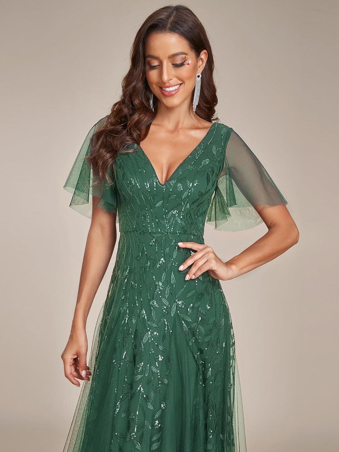 Ever-Pretty Women's Sequin Sparkly V-Neck Short Sleeve A-Line Floor Length Formal Evening Dress(Eucalyptus)