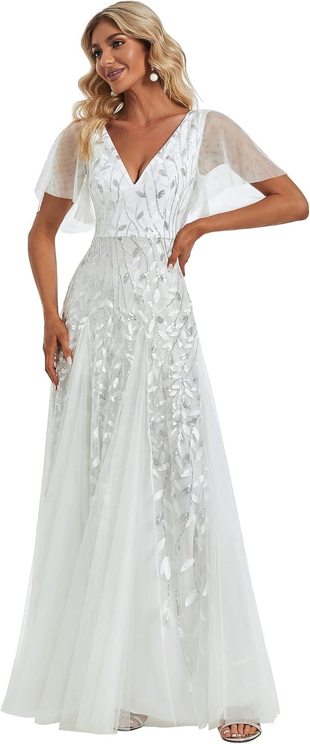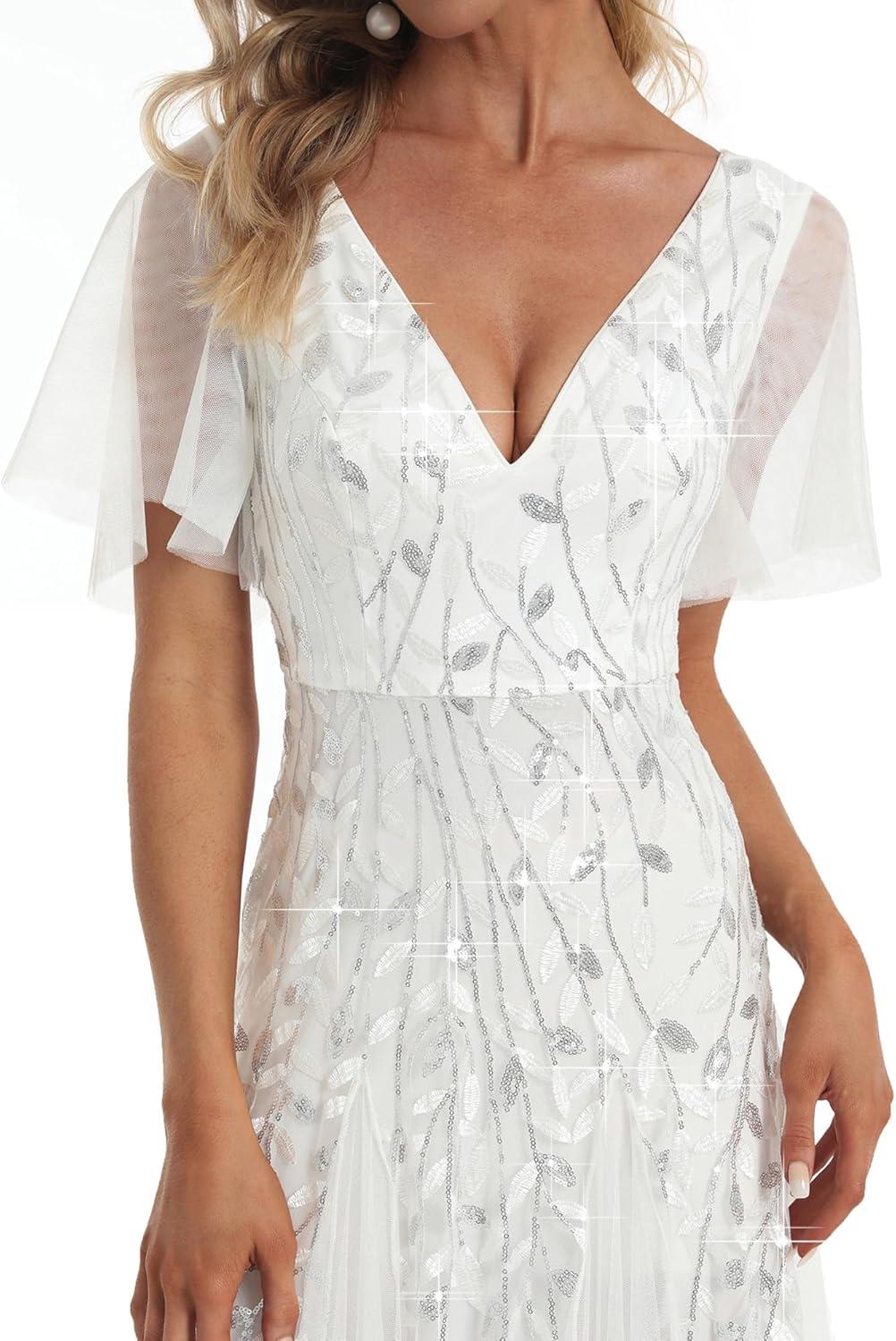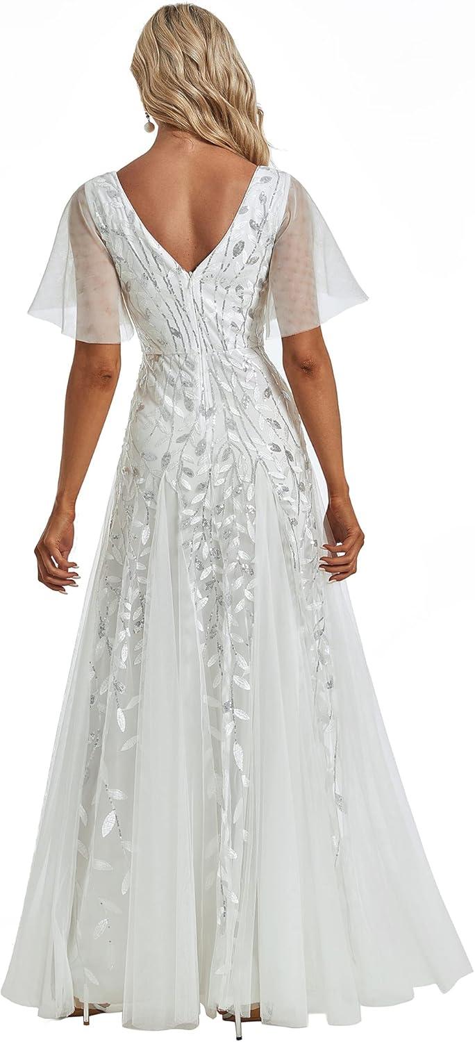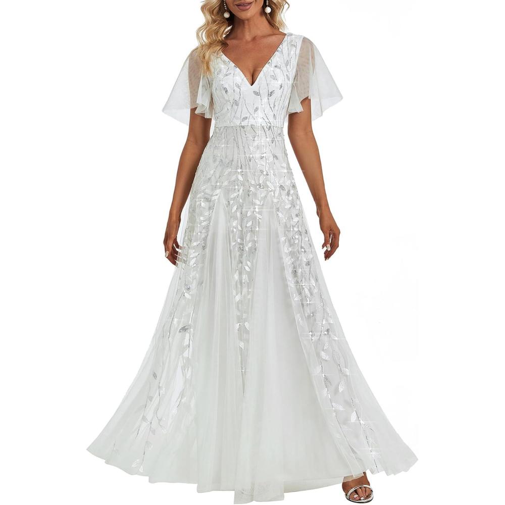 Ever-Pretty Women’s Sequin Sparkly V-Neck Short Sleeve A-Line Floor Length Formal Evening Dress(White)