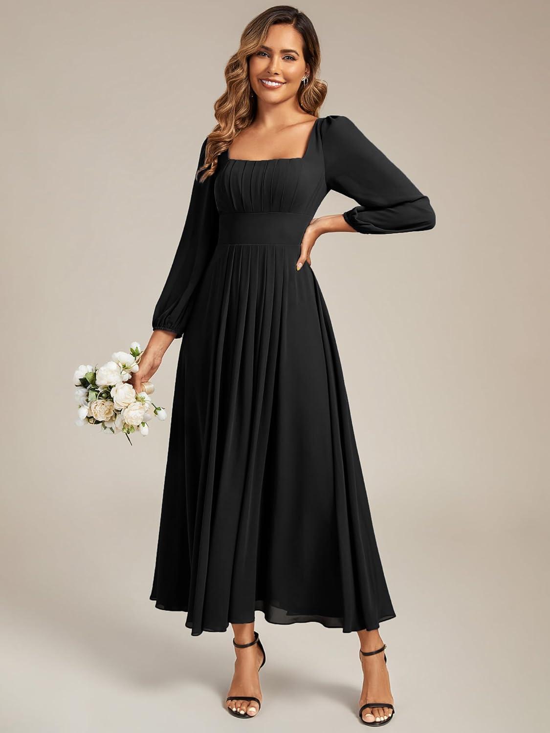 Ever-Pretty Women’s Square Neck Pleated Long Sleeve Chiffon A-Line Maxi Fall Wedding Guest Dress 02522(Black)