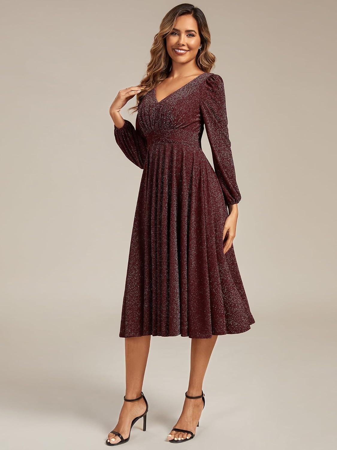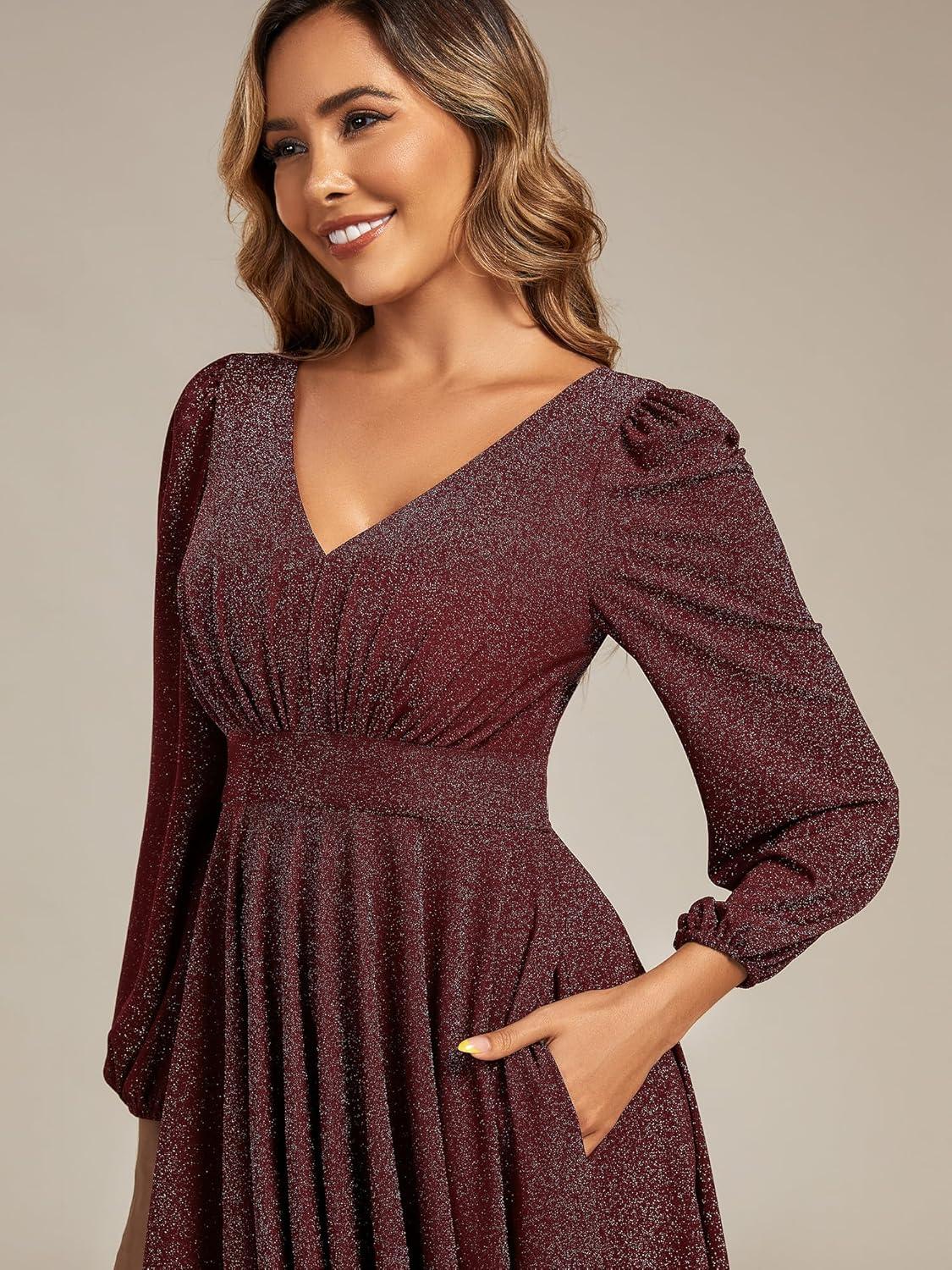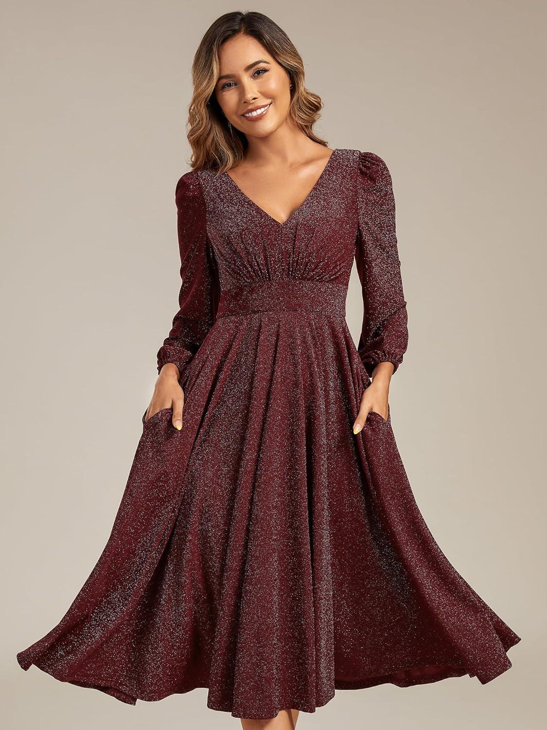 Ever-Pretty Women’s V-Neck Fall Long Sleeve Glitter Midi A-Line Formal Wedding Guest Dresses with Pocket 02523(Burgundy)