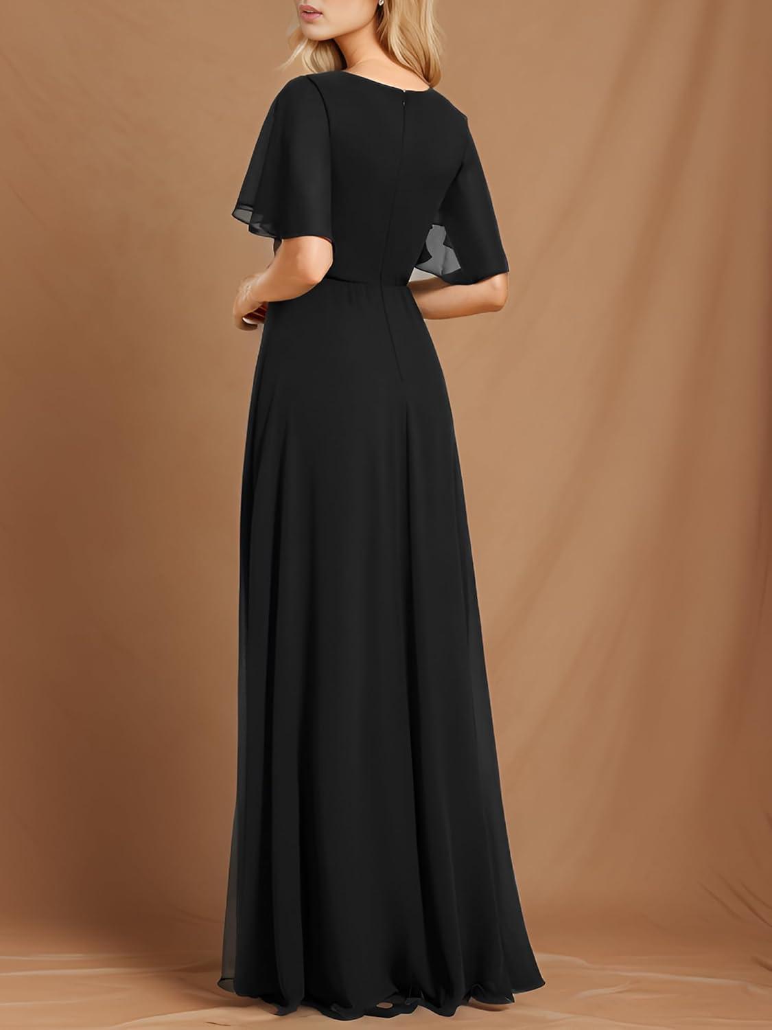 Ever-Pretty Women's V-Neck Flutter Sleeve Long Chiffon A-Line Appliqued Waist Bridesmaid Dress(Black)
