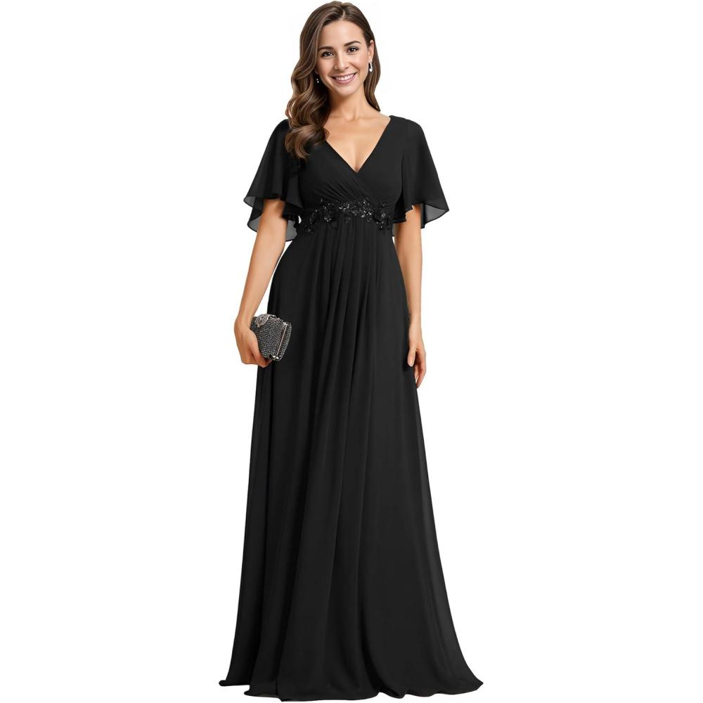 Ever-Pretty Women’s V-Neck Flutter Sleeve Long Chiffon A-Line Appliqued Waist Bridesmaid Dress(Black)