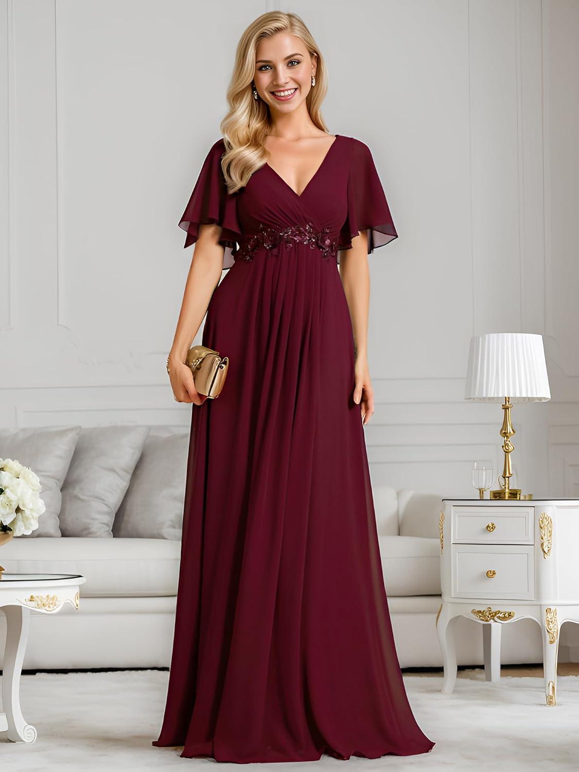 Ever-Pretty Women’s V-Neck Flutter Sleeve Long Chiffon A-Line Appliqued Waist Bridesmaid Dress(Burgundy)
