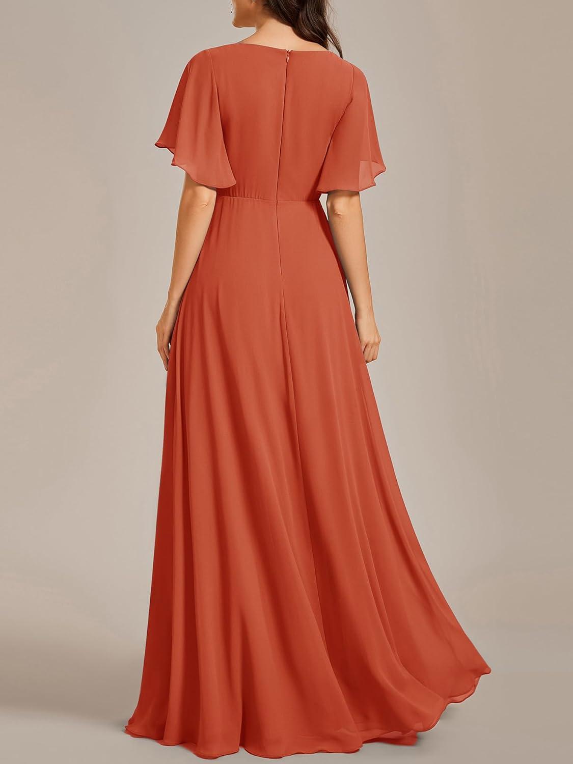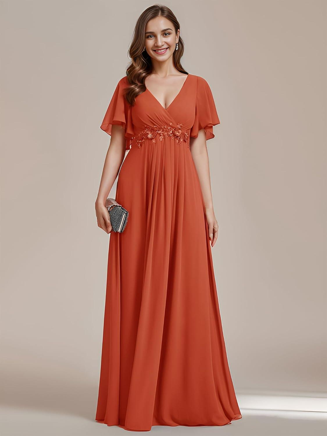 Ever-Pretty Women’s V-Neck Flutter Sleeve Long Chiffon A-Line Appliqued Waist Bridesmaid Dress(Burnt Orange)