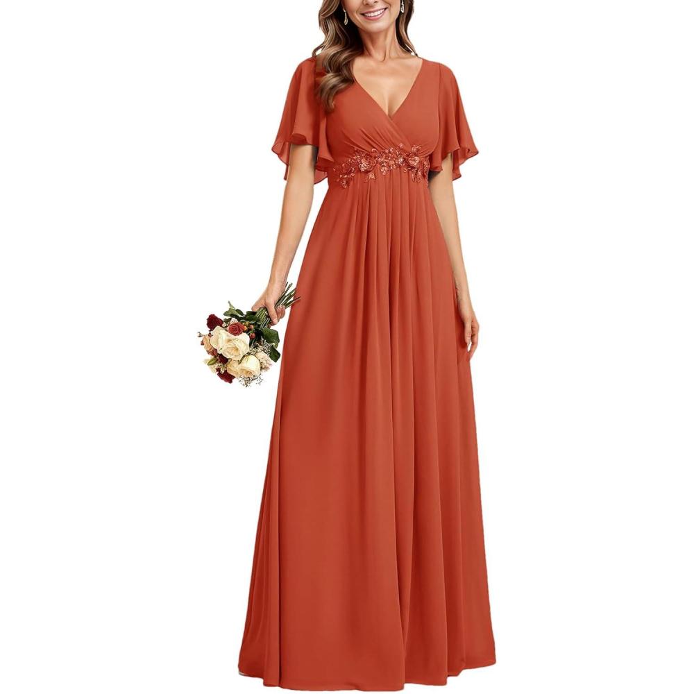 Ever-Pretty Women's V-Neck Flutter Sleeve Long Chiffon A-Line Appliqued Waist Bridesmaid Dress(Burnt Orange)