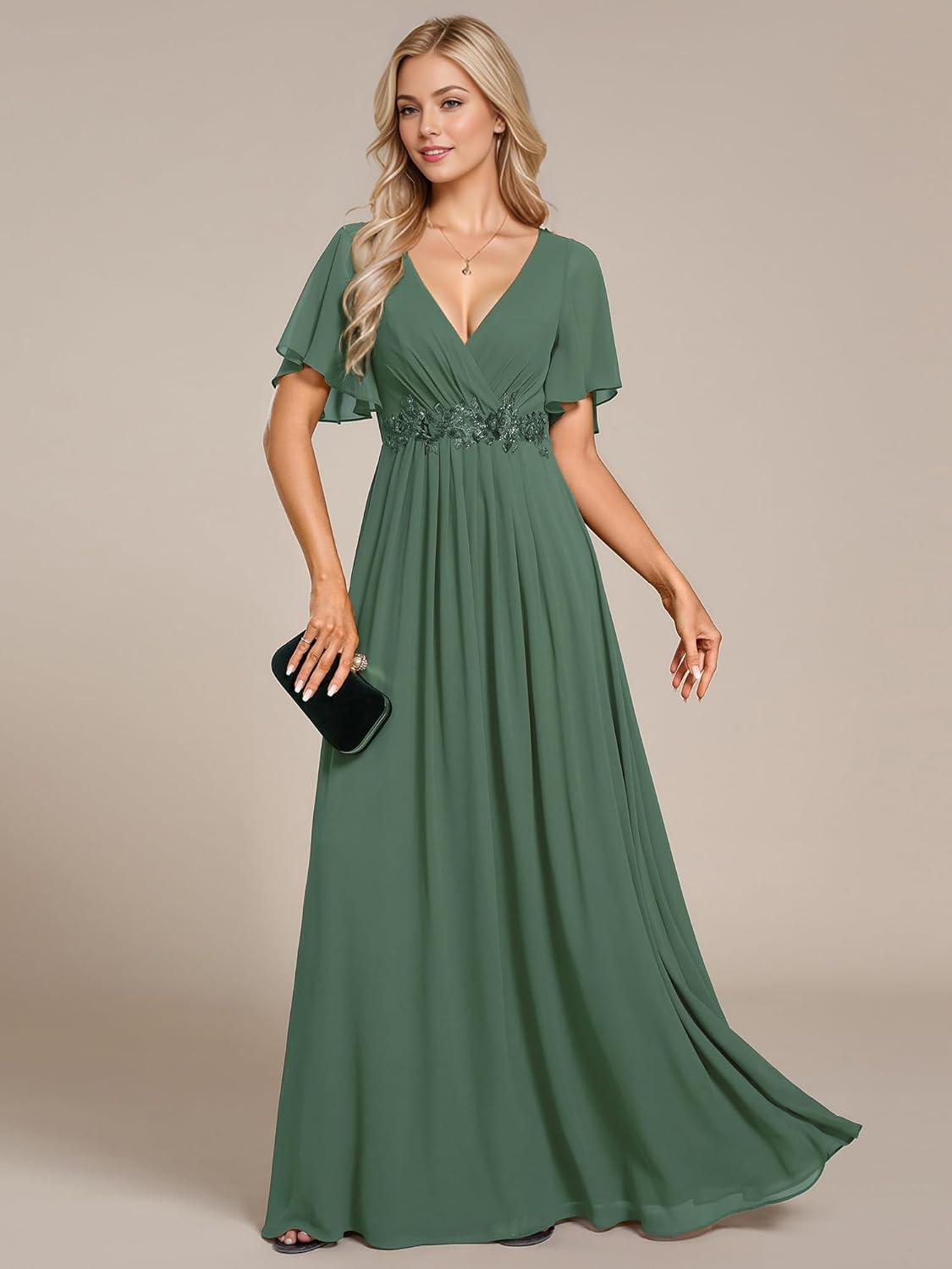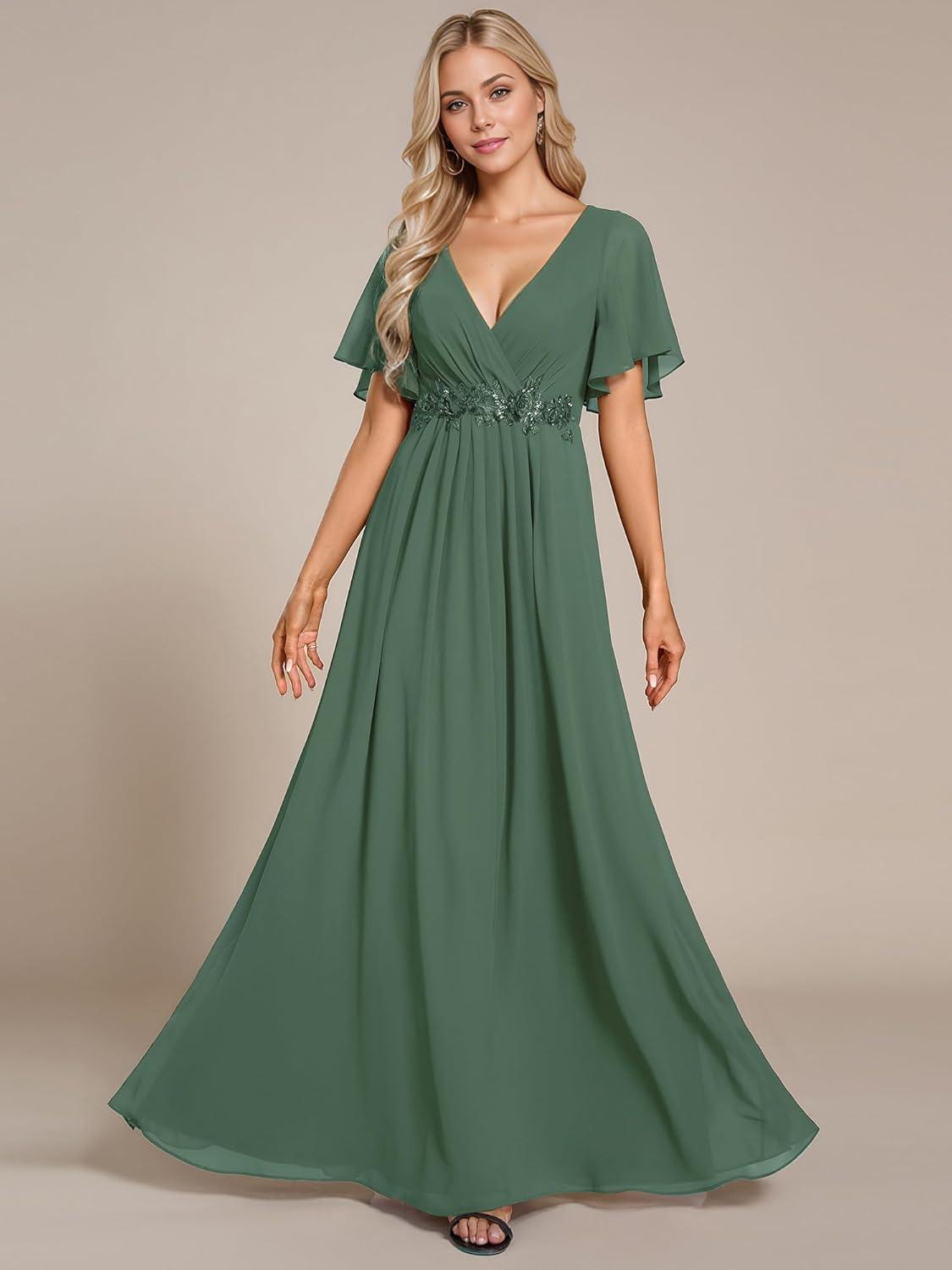 Ever-Pretty Women’s V-Neck Flutter Sleeve Long Chiffon A-Line Appliqued Waist Bridesmaid Dress(Eucalyptus Green)